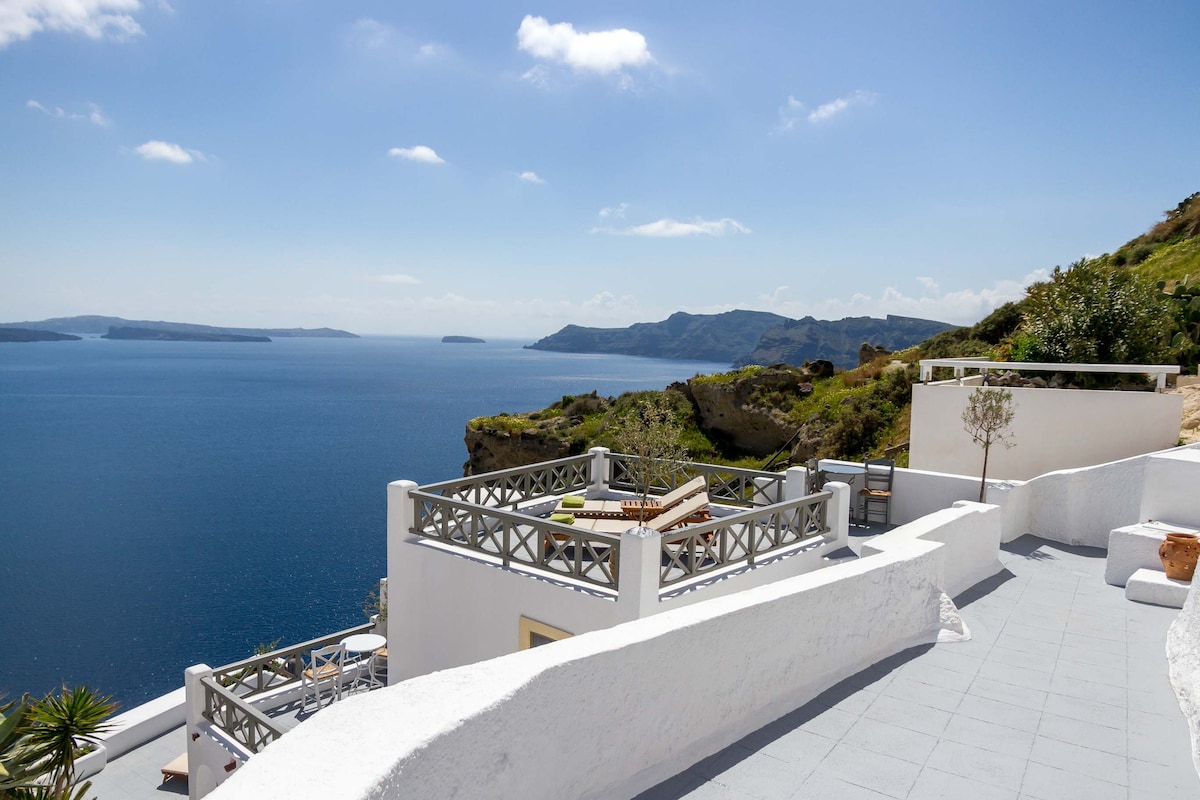 イアの崖の上にあるAmazing View Villaからは、カルデラと火山の島々の景色を一望できます。崖の端にはジャグジーがあり、そこに浸かりながら無限の青い景色を楽しむことができます。 新婚旅行や恋愛カップルに最適なヴィラは2階建てです。上の階にはダブルベッドとバスルーム付きの寝室があります。下の階にはラウンジエリアがあり、ジャグジーと息をのむような景色が楽しめる庭にアクセスできます。