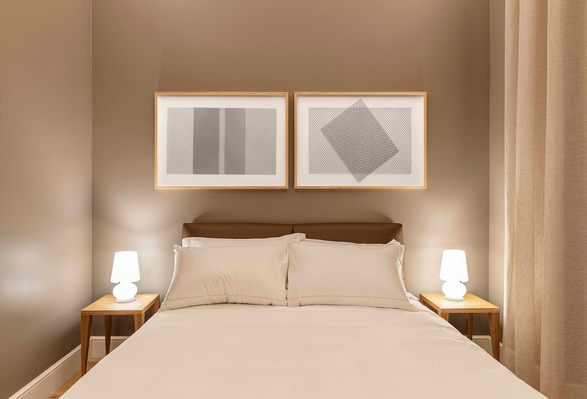 In no way a cliché or minimalist. For the traveller who knows no boundaries, an eclectic environment where decorative pieces are paired with sophisticated furnishings. The colourful lampshades are boldly mixed with elegant black and gold finishes, geometric curtains and a 1970s mirror. Let yourself be inspired ... Double room with a king-sized bed consisting of two single beds that can be separated, coat rack, bedside cabinets, armchair, mirror, suitcase stand
