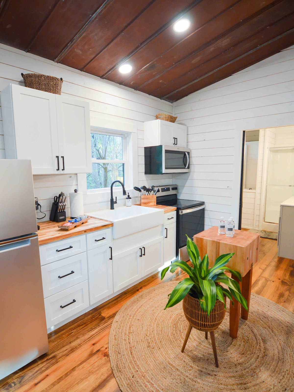 Perched on 20 acres along Catfish Creek, this enchanting tree house allows you to appreciate nature from a birds eye view. Whether it’s kayaking, canoeing, or exploring along the creek; relaxing in the hammocks and swings; engaging in a board game; or roasting marshmallows at the fire pit, Amenities include a full kitchen with full bath, outdoor shower, booth seating in dining table for up to 8, 2 bunk beds and loft style sleeping.