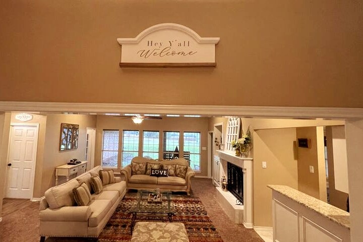 Take it easy at this unique and tranquil getaway. Rustic country log home nestled in mature oaks, pastures - part of 14 acres of blue cloud farms operation. Hangout, celebrate with friends and family - Full professional kitchen, outdoor grill, large living spaces, ping pong table in the game room, fire pit, cornhole, board games. Perfect for weekend getaways, family get togethers, graduations, weddings, movie nights, girls night in, boys night in, corporate offsite meetings, team building.
