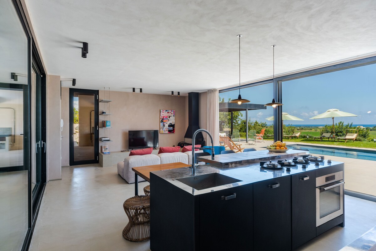 Ancient walls and modern conveniences coexist in peaceful harmony in this architect's house. Glazed doors in the bedrooms and living areas open onto a rolling landscape. Dine alfresco on a sheltered patio and go for a swim in a pool with a view. Le Casuzze is a holiday home which was completed in the summer of 2017 and designed by an architect from Bologna. It is perfectly integrated in the landscape behind the baroque town of Noto, and offers a superb view of the sea, the town and the natural beauty of the surrounding area. Finding a balance between luxury and simplicity is difficult task, which the the architect has mastered incredibly well. The three bedrooms (all of which have a separate en-suite bathroom) have replaced the stables, whilst the living room is placed in the old housing quarters. There where empty space previously separated the two buildings now stands the kitchen. A fourth bathroom is accessible via the living-room. All the rooms are connected with one another and can also be accessed via the outside terraces, which face the south and east respecitively – the former offering a superb panomaric view of the surrounding landscape. The seven-by-seven-meter large pool was designed to resemble a Gebbia: an antique water reservoir; The pool area constituting the transition between the house and the mediterranean Macchia. The entire property is defined by an incredibly calm and harmonious atmosphere and is the perfect place to wind down. Le Casuzze is located on a beautiful ridge behind Noto, overlooking the city and the sea. Take wonderful walks through the Mediterranean scrub from here, undisturbed by the few houses in the neighborhood.