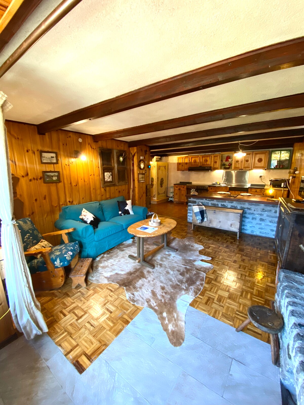 Alps Mountains. Italy. Aosta Valley. A cabin in a small village at 1600 meters,in the peace of meadows, grazing cows and mountains. Snow (usually) in the winter. A place of the heart, lovingly restored preserving the ancient beams of the roof. A wonderful view from the large windows and a special tranquility for those in search of peace, warmth and relaxation. The furniture is very nice: wood above all, but also more lively colors, and modern comforts. Quiet excursions, both on snowshoes or ski.