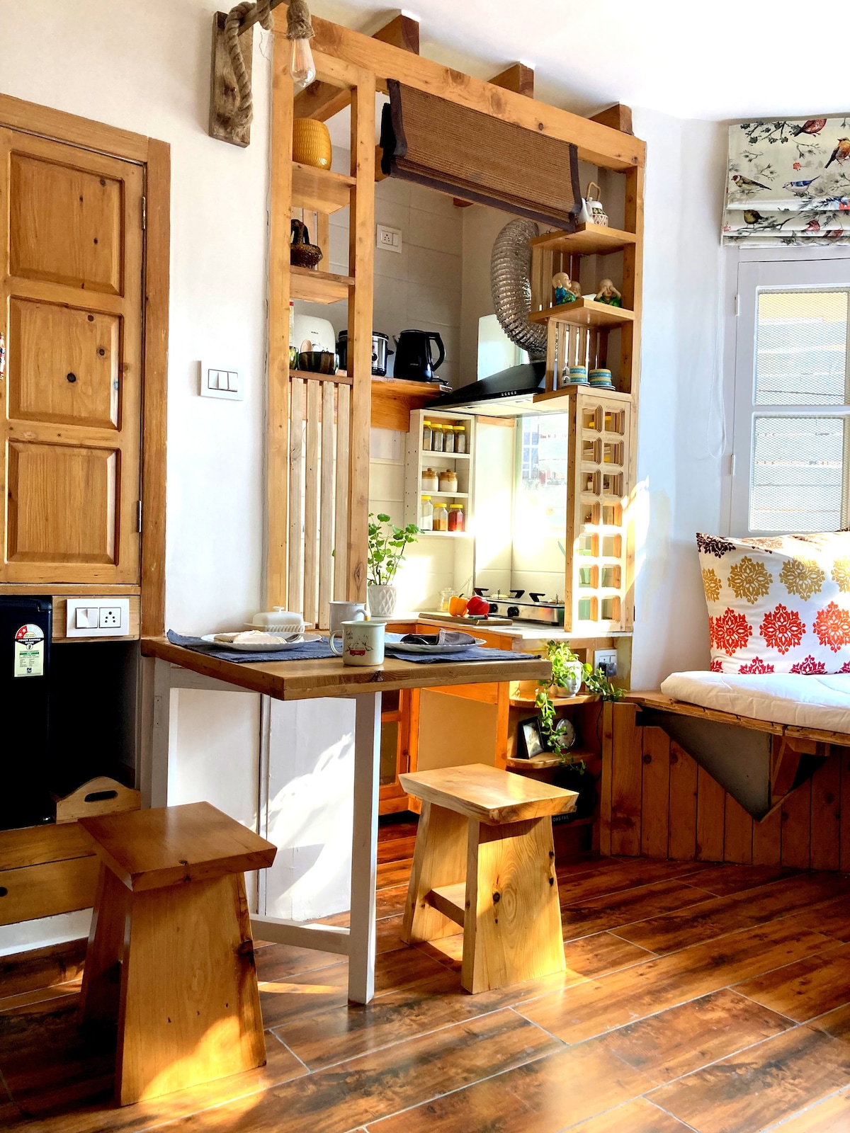 This Tiny house inspired studio, housed within a Victorian chalet, with its independent entryway and a private tiny lawn is sure to enthrall you. Be it the trending WFH requirements or freelancers on the move this place has been designed to cater for all. Furnished in cedar wood and whites, the studio reflecting eloquent modernity also preserves the typical mountain house elements. let yourself experience " House in a Room"
