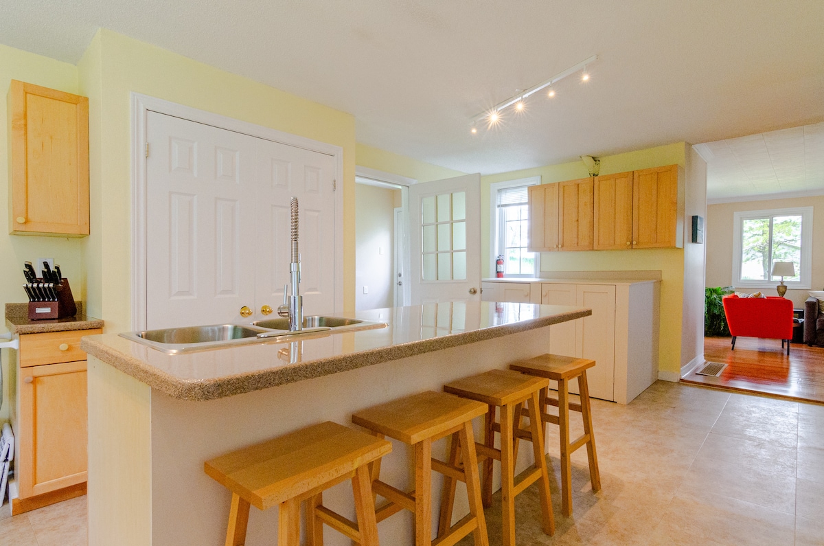 ピジョン湖のとても清潔で明るい、新しく改装された3ベッドルームのコテージです。ガノンズ・ナロウズに位置し、トロントから90分です。 とてもプライベートで広く、水平な芝生の区画で、子供に最適です。素晴らしいベッド、プレミアムキッチン、ガス暖炉、パドルボート、カヌー、隣のマリーナにボートランプがある大きなドック、子供向けの浅瀬。 クリスマス、新年、夏休みには、水泳、釣り、サイクリング、ハイキング、8つのゴルフコース、素晴らしい夕日のあるファイヤーピットが利用できます。 7月から8月は最低7泊、金曜日から金曜日までの滞在となります。