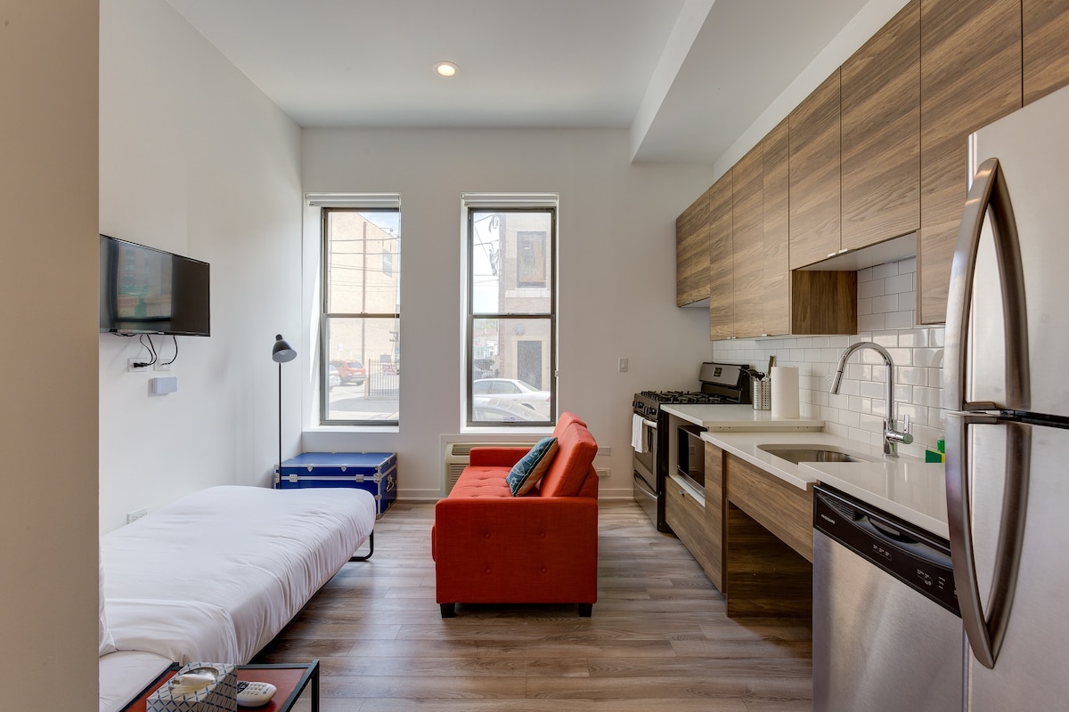 幅の広い通路、段差のないシャワールーム、バスルームの手すり、シンクの下のオープンスペースなど、ADAアクセシブルに設定されたユニークなお部屋です! このワンルームアパートは、ブルーラインL線を経由してダウンタウンに行くのに最適なシカゴのロケーションにあり、ホットなウェストループやランドルフストリートのレストラン街にも行けます。バー、ショップ、レストラン、コーヒー、酒屋、交通機関まで徒歩で行けます! スパバス、ユニット内ランドリー、フルモダンキッチンがあり、自宅のようにくつろげます。