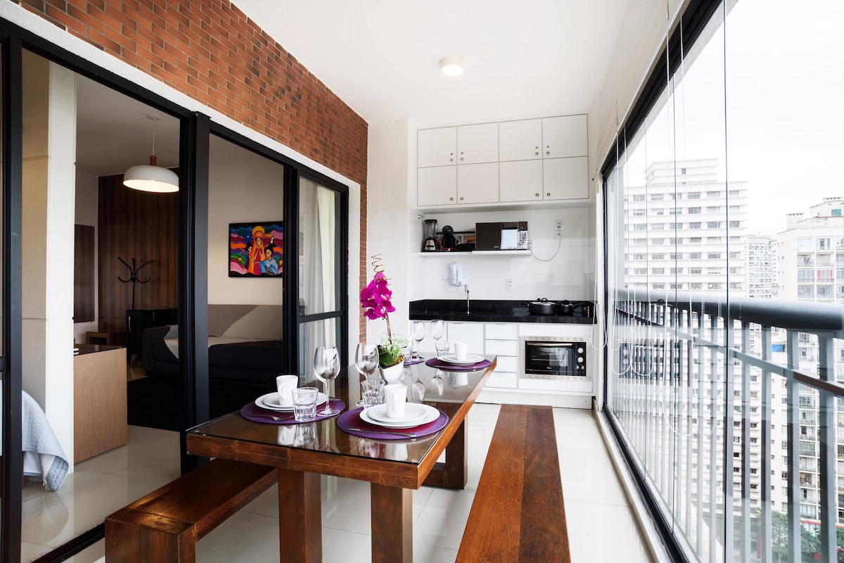 Stylish 50 m² apt. located at Bela Vista, has 24hr doorman. 2 bedrooms (only 1 with AC, and queen bed, the second one is quite small and can be used as an office, fitting a double-sized sofa-bed) and 1 bathroom. With amazing views from every window, it is a great place to work and relax. The private jet-tube at the balcony is a fantastic spot to enjoy the city views. Ideal for couples, professionals or small families looking for comfort, convenience, and one of the best views in the city.