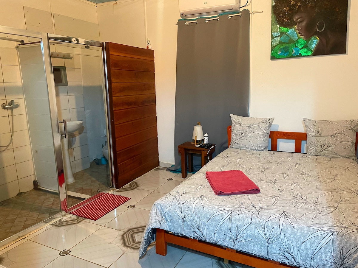 カイエンヌの市街地から5キロ、レミールモンジョリの住宅街に位置し、ビーチから数メートルです。 このゲストルームは、4つ星の快適さとサービスを提供します。 イタリア式シャワー、ヘアドライヤー、バスローブ、石鹸を備えた広々としたバスルーム 35平方メートルの部屋には、ダブルベッド2台、テレビ、ミニバー、机、Wi-Fi、アイロン台とアイロン、コーヒーメーカーが備わっています。