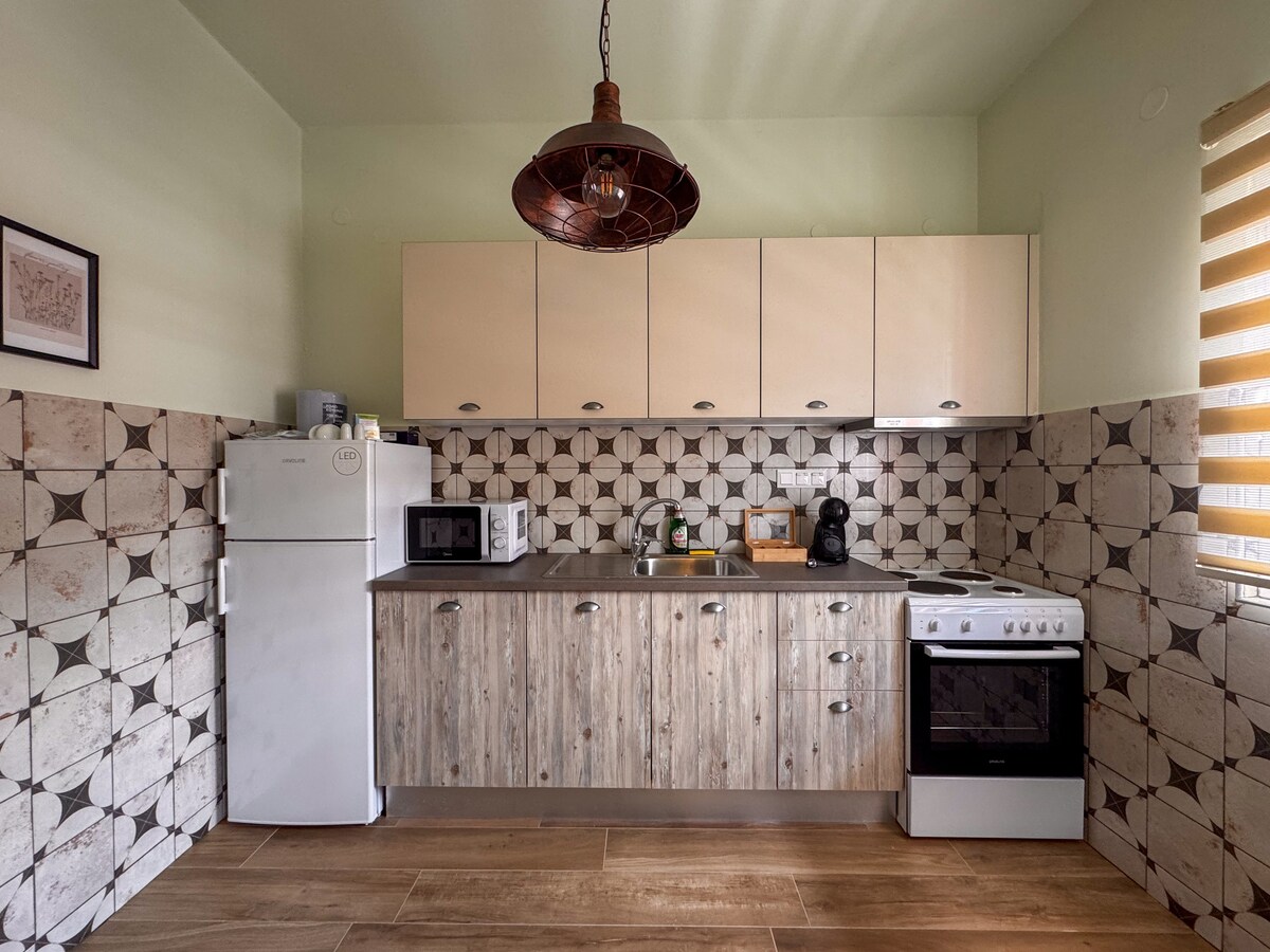 メテオラの岩の根元にある石造りの豪華な邸宅にある約55平方メートルの独立したアパート。伝統的なスタイルで装飾され、設備が整っています。寝室2部屋、バスルーム1部屋、キッチン付きのリビングルームがあります。メテオラの岩を見渡せるバルコニーと無料駐車場があります。メテオラの修道院からわずか2km、カランバカから2km、カストラキの広場から300mの距離にあり、アクセスが簡単です。