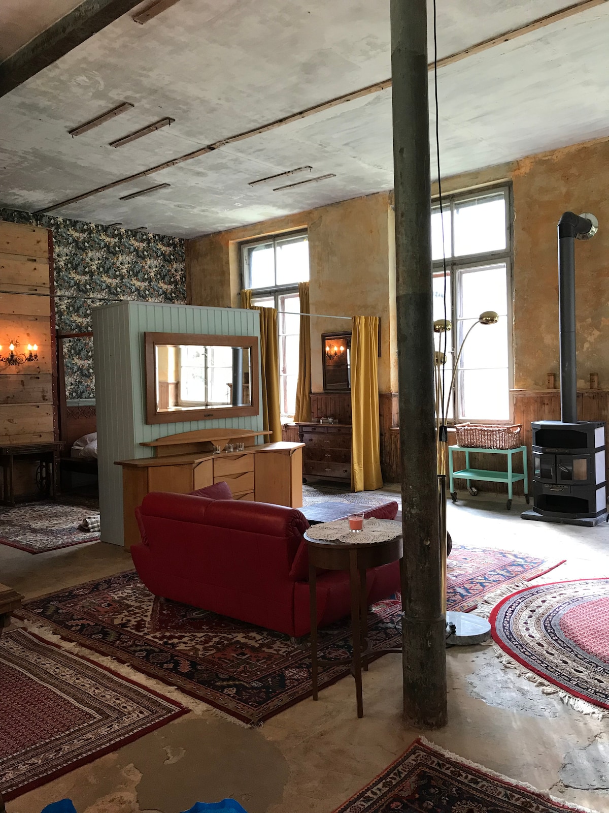 ファクトリーロフト180平方メートル、4名様用 四柱式ベッド1台、ダブルベッド1台、暖炉と薪ストーブ、 車椅子でのアクセス可能、専用の湧き水 森の中に6名様用の200平方メートルのロフト2号室もございます。 犬は歓迎です。滞在期間中、犬1匹につき10スイスフランの清掃料金がかかります。こちらのホストに直接お支払いいただけます。