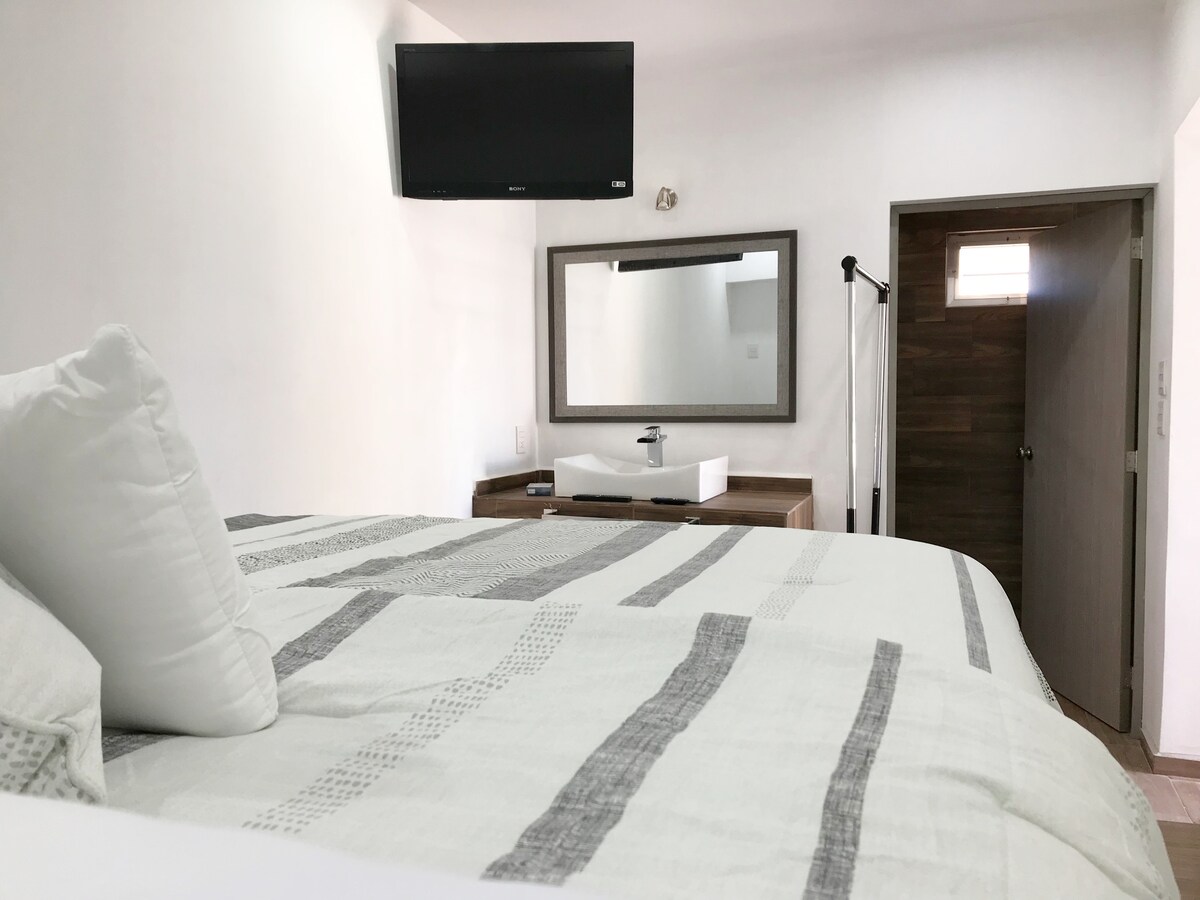 A tan solo 3 cuadras de la hermosa Playa de Mazatlán se encuentra Suite Golden Hour! Un espacio super cómodo para descansar en tus vacaciones! Habitación completamente privada con entrada independiente, con cocineta, frigobar para mantener tu cerveza helada, baño completo privado, TV 33” y Mini Split para mantenerte fresco después de un día de Playa Cerca de Restaurantes, Playas, Bares, La Marina, Farmacias y Supermercados. Suite Golden Hour es tu mejor opción estas vacaciones!