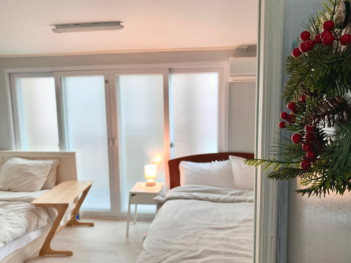 春天スカイモンステイは、義岩洞自転車道(春内道4コース)の警察忠魂塔に隣接しているため、川沿いを自転車で走ったり、散歩したり、絶景を眺めたり、癒されたりするのに最適な宿泊施設です。 *特徴:プライベートに休めるモダン韓屋。貸切宿泊施設。 * 所在地:春川駅からタクシーで約10 ~ 15分。 * 設備:すぐ1分圏内に西春川ハノロマート新店があり、年中無休で買い物に非常に便利です。 * バーベキュー:スタンディング電気グリル(倉庫カフェ内)または屋外バーベキューグリルを無料でレンタルできます。 *準備:炭と鉄網は提供されていません。通りの向かい側にあるハノロマートで直接購入する必要があります。 *カラオケ:騒音の苦情を防ぐため、夜8時までのみご利用いただけます。 *自転車2台。自転車ポンプ。セルフ使用。 *サービス:カプセルコーヒーとカップラーメンのサービス。 *ドアの閉め方に注意:川が近いので、夏場は虫が多くなります。出入りの際はドアを閉め、夕方はブラインドを下げるか、電気を消すことをお勧めします。