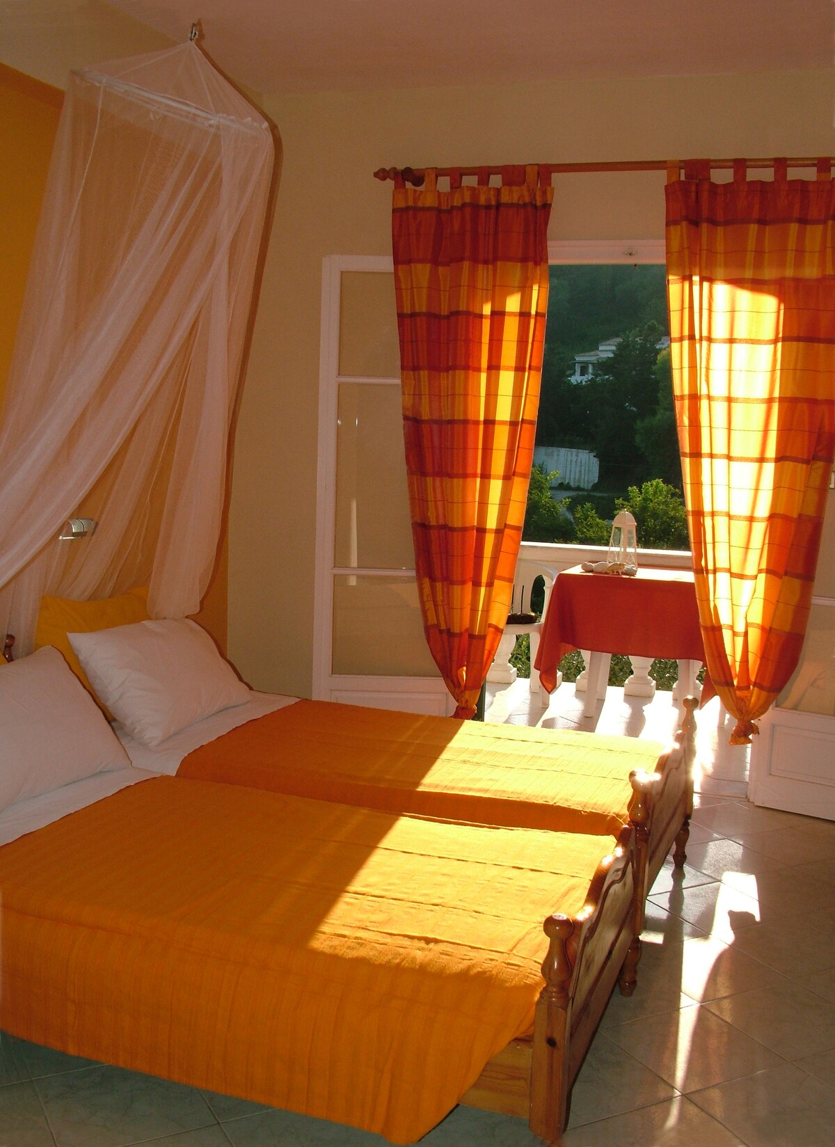 私たちは、島の南の最も狭い部分にある村ペリボリにいます。タヴェルナ、ショッピング、コルフ島市へのバスは徒歩5分です。漁村がある東側までわずか2 km、長い砂浜がある西海岸まで3 kmです。あなたの宿泊施設は静かで、庭を通して私たちと繋がっている別棟にあります。これは、それぞれ2匹のカメ、猫、愛らしい犬と共有します。ここからは、本土の山々の上に昇る日の出を見ることができます。