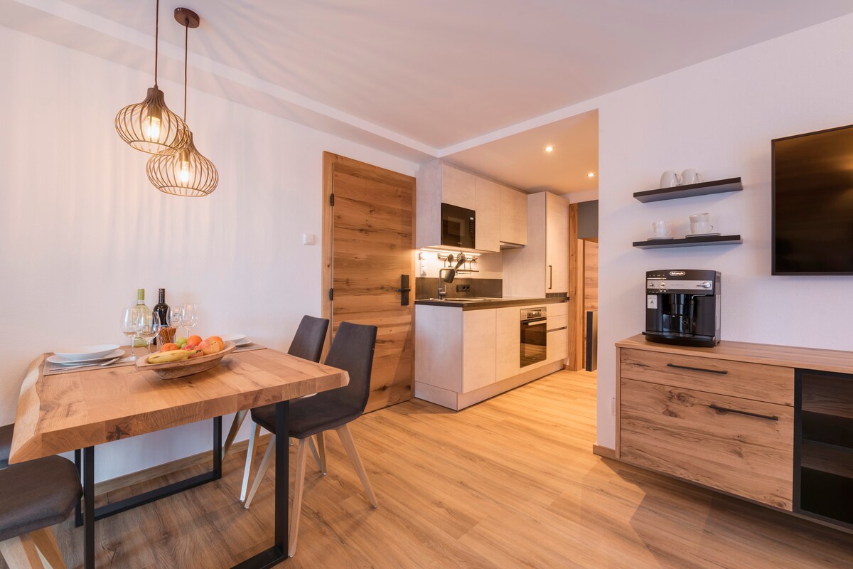 プレミアムアパートメントは細部にまでこだわって装備されています。ハイライトは山の景色を望むテラスです。広々としたテラスにあるジャグジーとサウナでリラックスできます。 これはプレミアムスタジオアパートです。キッチン、リビング、ベッドルームは同じ部屋にあります。2人用のキングサイズベッドがあり、さらに2人用のソファベッドを用意することができます(同じ部屋にあります!)