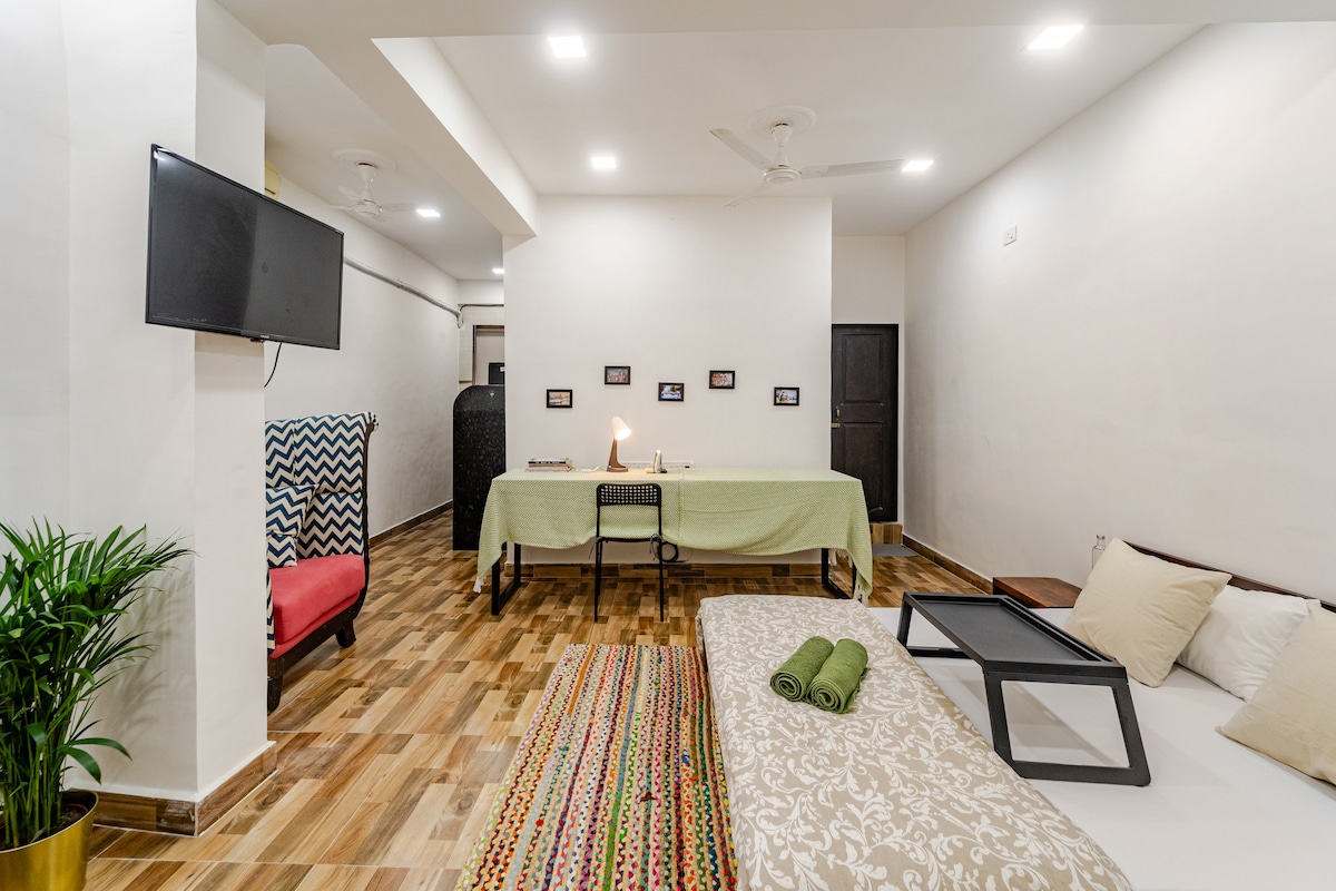 この2BHKスペースは最近改装されたばかりで、エアコン、テレビ、高品質のメモリーフォームベッド、豪華な家具など、さまざまなアメニティを提供しています。さらに、広々としたバルコニーがあり、リラックスできます。 また、2つ目の寝室へは最初の寝室を通る必要がありますのでご注意ください。別の通路はありません。 アラカルト価格で朝食をご用意しております。朝食のオプションを探索するには、メッセージをお送りください。