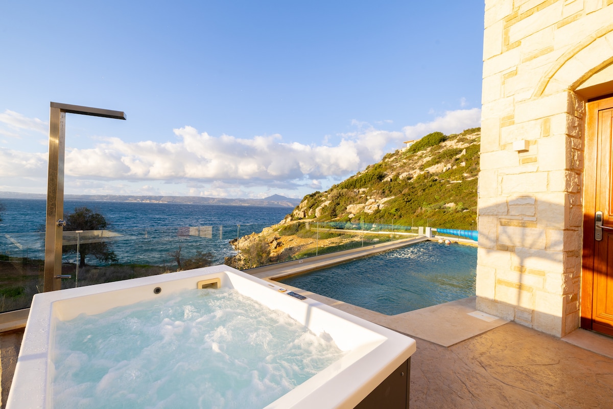2階建てのヴィラの2階バルコニーからは、スーダ湾の息をのむような景色が広がっています。景色を眺めていないときは、プールデッキでくつろいだり、プールに浸かったり、寝室の前のプライベートホットタブでリラックスしたりできます。テレビとファイヤーテーブルを備えたプールデッキラウンジエリアをぜひご覧ください。 お客様は私たちの唯一のゲストです。料金には、一部の場所で別途請求される気候変動対策税が含まれています。