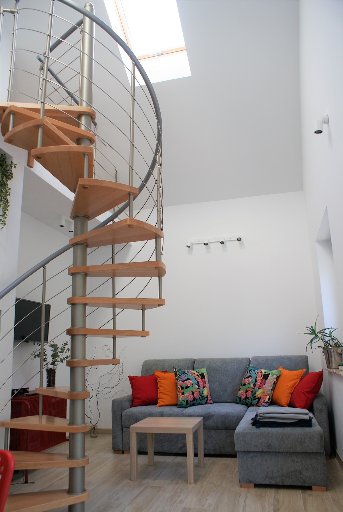 建物にはエレベーターがあります。アパートメントは2階建てです。下の階には家電*が揃ったキッチン、バルコニー付きのダイニングルーム、バスルーム、ソファベッド、テレビがあり、上の階(中二階)にはダブルベッド1台とマットレス2台、そして私物用のコモード2台があります。 最上階にあるため、屋根窓から光が差し込みます。 * -洗濯機、食器洗い機、IHコンロ付きオーブン、電子レンジ、冷蔵庫、コーヒーメーカー、インターネット600mb/s