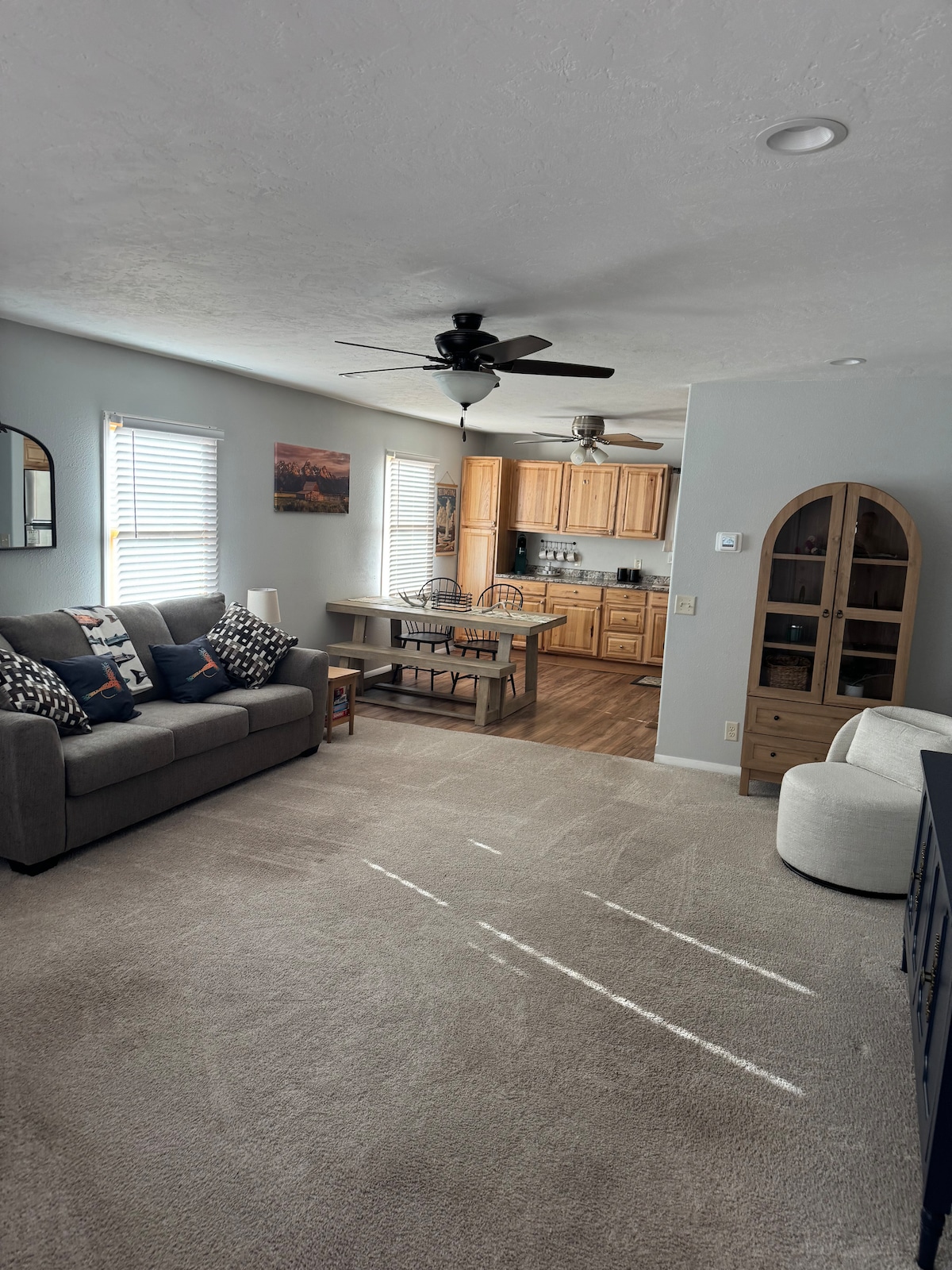 この家にはたくさんの窓と自然光があります。 家の夜の照明は明るく、必要に応じてムードを暗くするためのランプが周りにあります。 内装はシンプルでナチュラル、リラックスできます。 2階では、大画面テレビ、バートップ、ダイニングテーブル、簡単にフルサイズベッドにできるソファなどが備わった充実したキッチンをお楽しみいただけます! 下の階では、フーズボールコーヒーテーブルでフーズボールのゲームを楽しんだり、フルサイズのビーンバッグや快適なソファでリラックスしたり、テレビを見たりできます。 必要に応じてランドリールームをご利用ください。