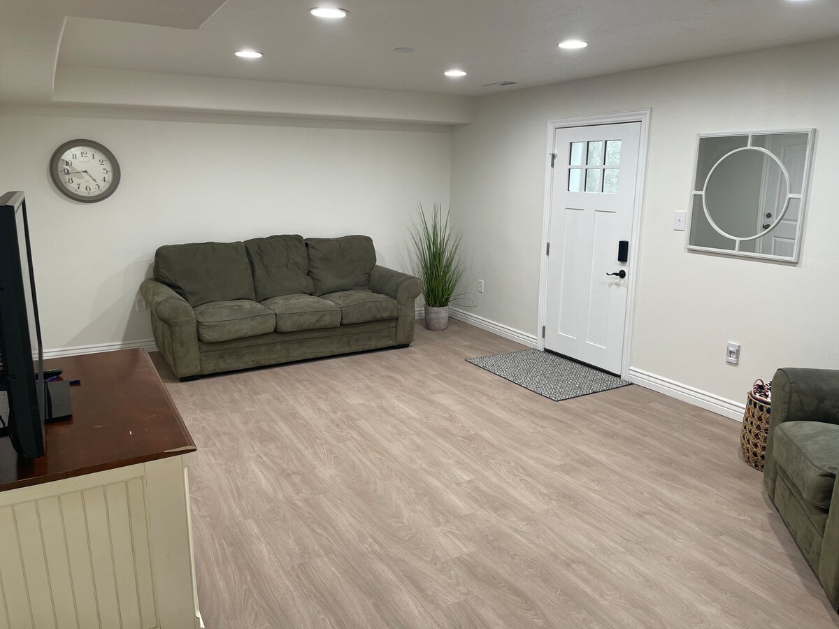 Spacious one bedroom basement apartment in a beautiful, quiet neighborhood. Newly remodeled with a separate entrance. Roomy living/dining room, full kitchen, and newly carpeted bedroom. Fully fenced backyard (shared with host) with shade, grass, patio, and BBQ. 15 minutes from BYU, 35 minutes from Sundance, 15 minutes from Hobble Creek Golf Course, and 10 minutes from Walmart and other shopping.