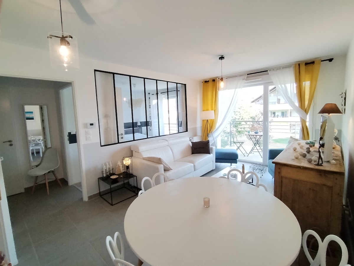 ディヴォンヌの中心部に位置し、レストラン、ショップ、湖、コペ、ニヨンへのバス停まで徒歩2分の理想的な立地にあるこの45平方メートルのアパートメントは、完全に改装され、独立した入り口を備えた一戸建てにあります。明るくモダンなアパートは、広々としたリビングルームと設備の整ったキッチン(食器洗い機)、快適な寝室、シャワールームを備えています。自然と快適さの間での滞在に最適です! シーツとタオルは用意されています!
