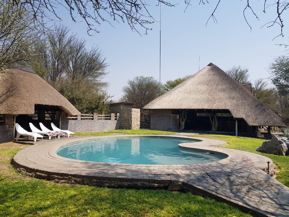 Enjoy a unique stay in a historic farmhouse on a quiet, scenic cattle farm. You can self cater or we can provide dinner. The farmhouse is ideal for both short and long stays offering a lovely swimming pool, fast WiFi, work areas, endless space to yourself and a nearby pond, which attracts a variety of birds and wildlife. Located 1km off the A3, between Ghanzi (Gantsi) and D'kar. Both bedrooms are air conditioned and have queen size beds and en-suite bathrooms.