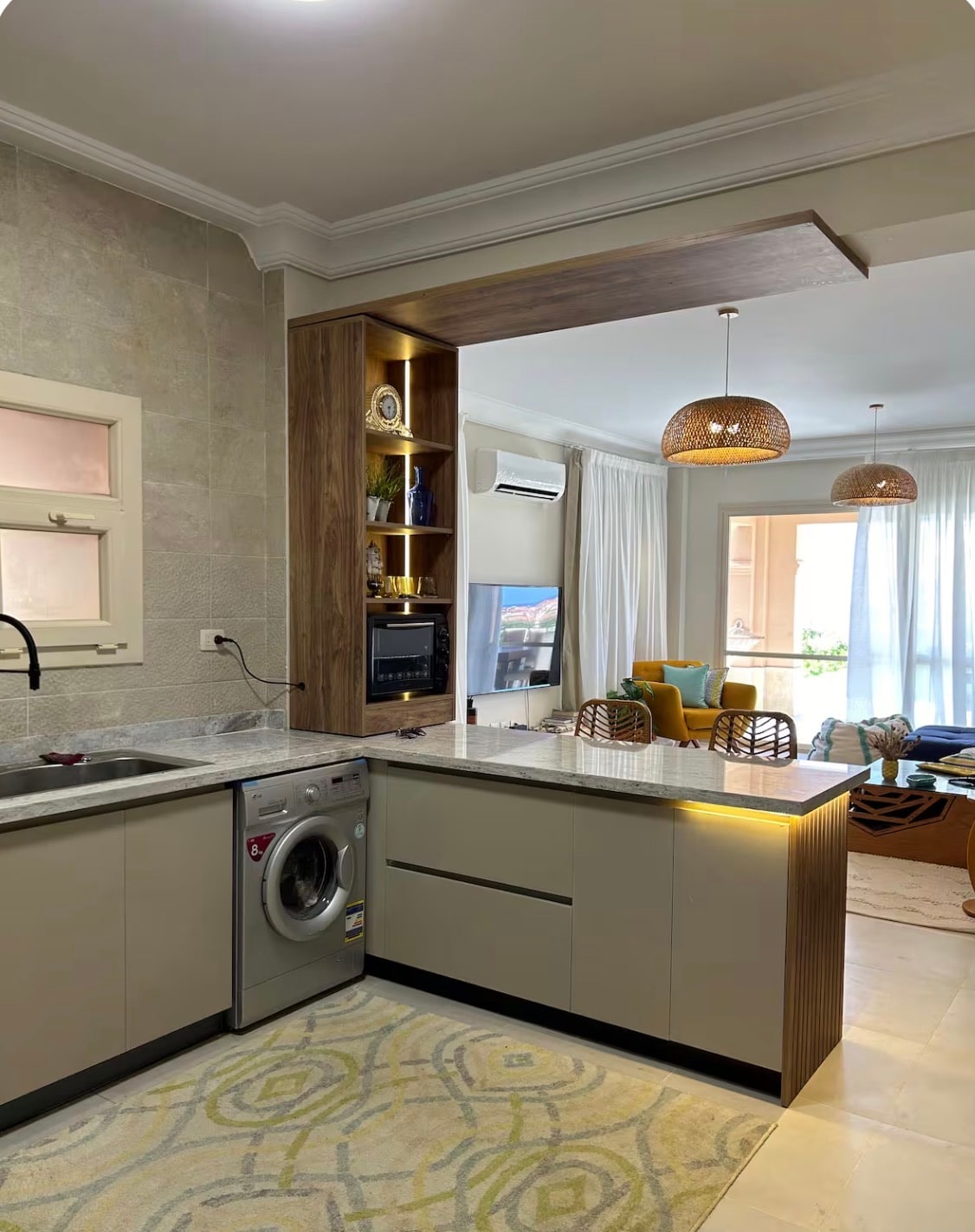 このペントハウスは、地中海に面したエジプトの北海岸に位置し、シンプルさとすっきりとしたラインを表すシンプルなスタイルを示しています。 キッチンにはすべての家電が備わっており、すべてのニーズを快適に、視覚的に、実用的に提供するために、完全に正確かつ控えめな方法で配置されています。使用されている素材の豊かさを損なう要素を損なうことなく、望ましい簡素化の可視性を実現することに特に注意が払われています。