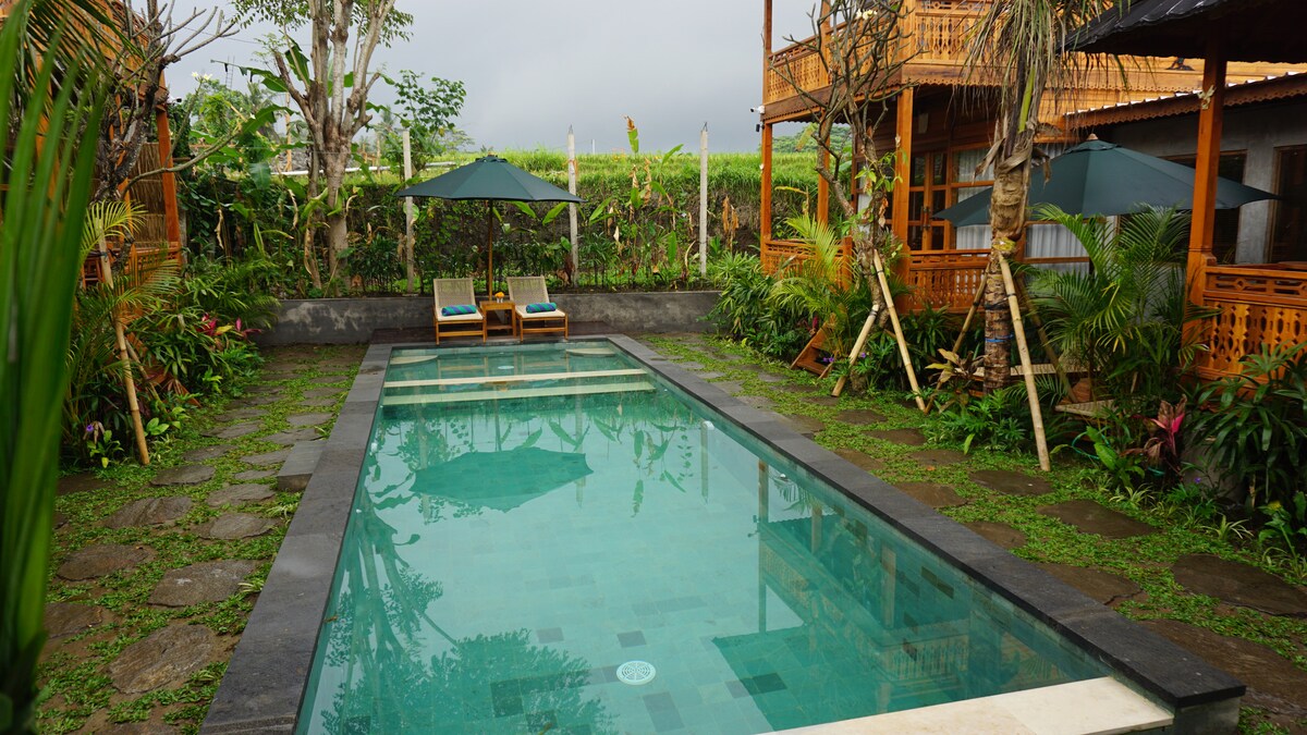 このロマンチックな木造ヴィラは、喧騒の交通から離れた田んぼと自然に囲まれた最高のエリアにあります。ウブドでも絶対に体験すべきエキゾチックで活気あるエリアになっています。 ヴィラはすべて木材を使用した非常にユニークなエコリゾートで、すべてがプールに直接アクセスできます。ゲストのみなさまに最高のサービスをお届けすることを保証し、どんなお問い合わせにも対応いたします。ウブド中心部までわずか10分です。