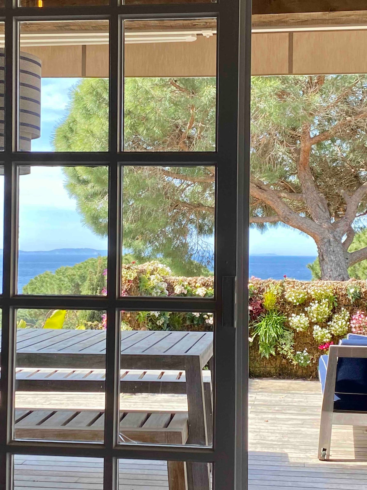 Logement Entier: appartement rez de jardin avec terrasse en bois vue sur la mer et les pins parasols et une place de parking au cœur de Gigaro dans une résidence sécurisé. L’exposition Sud Ouest vous permettra de profiter du soleil toute la journée et du coucher du soleil. L’accès à la plage est à 7 minutes à pied. L’appartement contient un lit et un canapé lit, une cuisine, une salle de bain et d’un toilette séparé