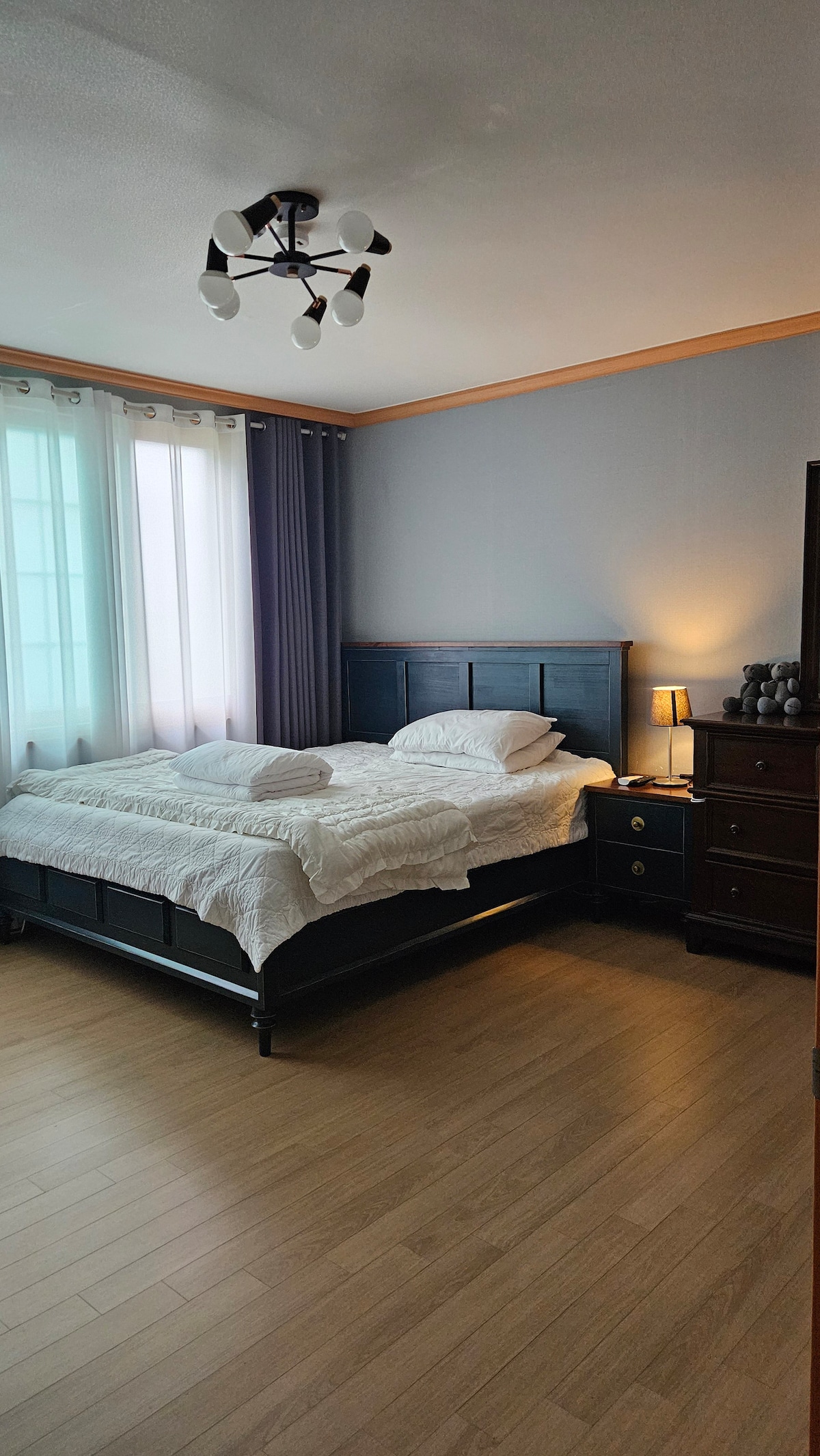 ✔︎ 日常から抜け出して休める空間を提供するJune houseです。 ✔︎June houseは最近建設設備が完了した新築の建物です。 内装に高級素材を使用し、家電製品も 家具も最新のものです。 宿泊施設の特徴 ◼︎ 80平方メートルの複数階建ての新築建物 ◼︎ 高温殺菌洗浄した白い寝具 ◼︎ 雲のようなベッドマットレス ◼︎ 部屋5室(最大収容人数8名) ◼︎ クイーンベッド3台、シングルベッド2台(バンカータイプ) ◼︎ ジム完備 ◼︎ 屋外テラス ◼︎ 1階の屋内プール&韓牛専門店営業中(別途利用) ◼︎ ヤマハオーディオ8チャンネル完備 ◼︎ 都心の自然風景 ◼︎ 植物園まで5分