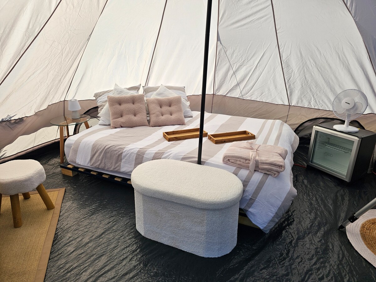 谷間の絶景が見える素晴らしい場所です。リラックスして、くつろぎ、元気を取り戻すのに最適な場所です。2つあるユニークなグランピングサイトの1つで、キャンバスのベルテントには4人用の快適なダブルベッドと2つのフロアマットレスがあります。馬の箱型トレーラーを改装した、屋根付きの専用キャンプキッチンと専用バスルーム。木陰か日当たりの良い場所を選んで、この平和な楽園で自然を満喫してください。暗い夜空の星空を眺めましょう。光害の少ない場所です。毎日、埋め込み型プールで泳ぎを楽しめます。