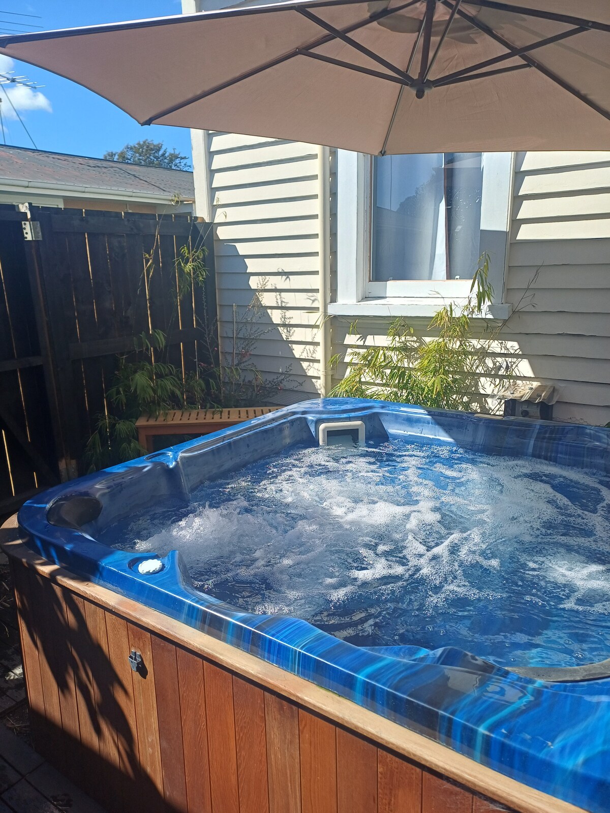 CBDの静かなロケーション、カフェの向かい側。 スーパーと町の中心部まで徒歩2分。タラヘル川の近く、植物園の近く。ワイカナエビーチ(徒歩20分)、ミッドウェイビーチ、キワプール(徒歩35分)まで川沿いの遊歩道を楽しむことができます。または、歩道橋を渡ってファーマーズマーケット(5分)に行きます。 専用スパ/ジャグジーがあり、専用玄関があります。 プライベート(通りから離れています)。 高速インターネット。 角を曲がったところにコインランドリーがあります。 コンチネンタルブレックファーストをご用意しています。