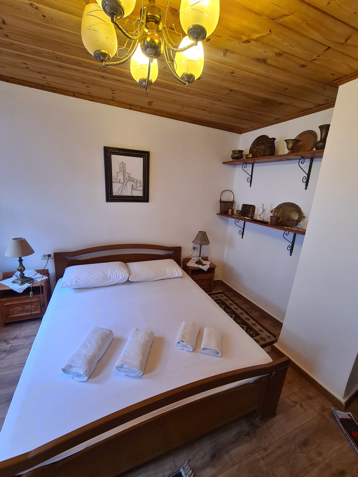 The house is located 800 meters away from the historic part of Gjirokastra, offering a stunning view of the castle and the surrounding mountains. It can accommodate up to 4 guests It consists of 2 bedrooms, a bathroom, and a fully equipped kitchen.