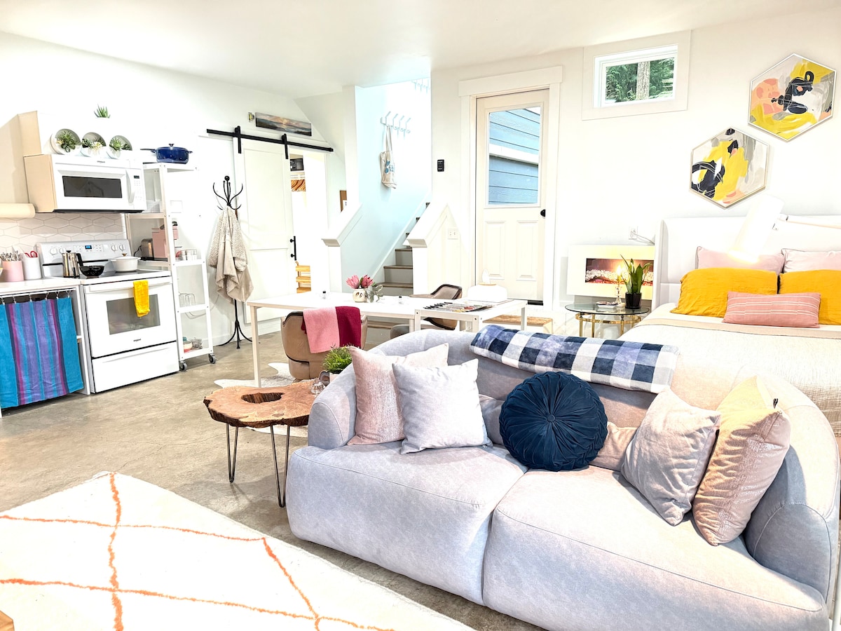Loft Luna is a boho studio exuding world traveler vibes. The space is located in Sudden Valley, a lakeside community, nestled in the forest near Lake Whatcom. Loft Luna has thoughtful designer touches throughout and features 1 queen bed. Come stay in this artsy loft to enjoy nature surrounds. Please note that the owner and dog live in the main house. Your entrance and parking are private.