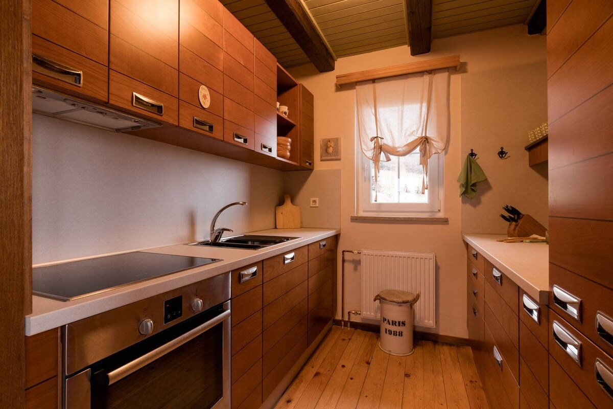 居心地の良い快適なコテージには、モダンで設備の整ったキッチンがあります。庭にはジャグジー、サウナ、暖炉、バーベキューがあり、料理を準備して思い出に残る夕日を楽しむことができます。コテージの魅力的なインテリアは、木材、ガラス、石材を組み合わせたものです。ブドウ園、森、さえずりの鳥に囲まれたコテージSončni Gričでのリトリートは、自然とその癒しの力につながります。 Sončni Gričは、高速道路のTrebnje East出口からすぐの場所にあります。