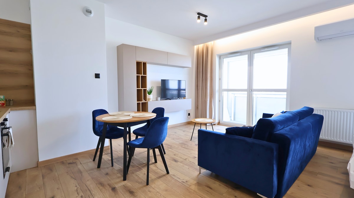 Nowy, w pełni wyposażony apartament z kuchnią, jadalnią, sypialnią, łazienką i garderobą zlokalizowany w odległości ok. 500 metrów od ścisłego centrum miasta. Cicha, spokojna okolica, własny parking. Obiekt monitorowany. Wyposażenie m.in.: czajnik, ekspres do kawy, zestaw garnków, sztućce, nakrycia, szkło, zestaw pościeli i ręczników, kosmetyków, papier toaletowy. Bezpłatne wifi i telewizja. Możliwość konfiguracji 2 łózek pojedynczych lub 1-go łóżka podwójnego. Na wyposażeniu wygodna dostawka.
