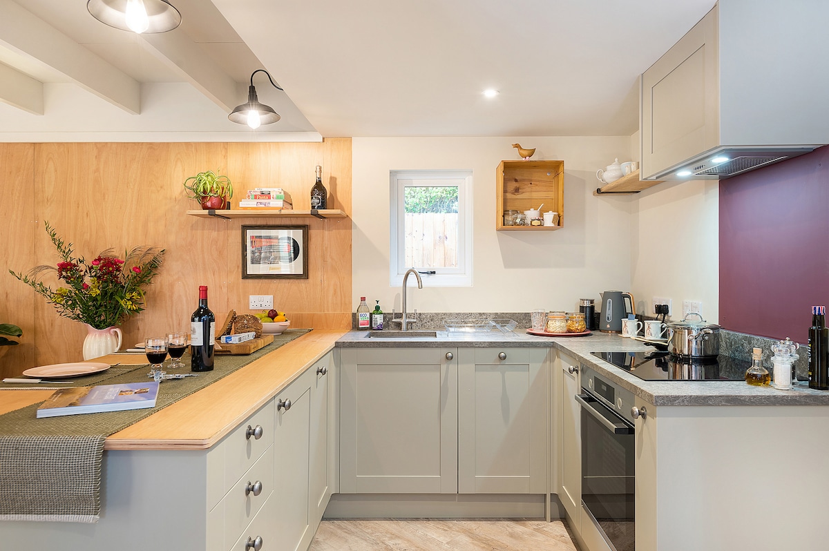 Our Cabin offers a cosy independent stay with a fully equipped kitchen, lounge, bedroom with super-king bed, luxury en-suite shower and utility with additional toilet. This eco friendly home has air sourced underfloor heating throughout and contains many upcycled items from the exterior reclaimed scaffolding boards to the many repurposed gems to be found inside. Stepping outside there is a private south facing patio and garden with its own parking space, all just a leisurely walk from town.