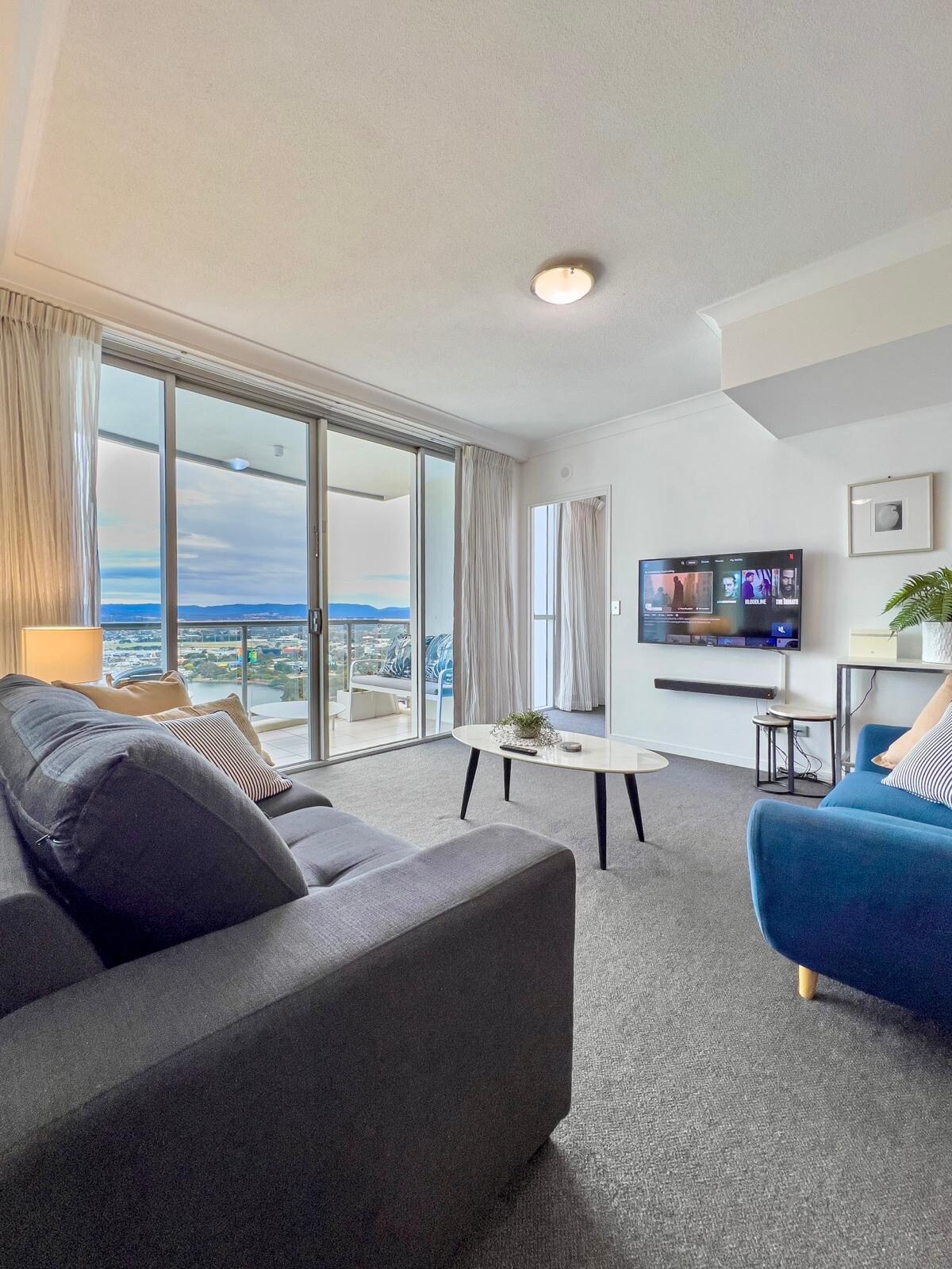 33階のスカイハイエスケープ! この豪華なベッド2台、2つのバスルームのアパートメントは、床から天井までのガラス、オープンプランのリビング、そして広大な都市、川、そして内陸の景色を誇っています。左側のバルコニーに足を踏み入れると、輝く海🌊とサーファーズ・パラダイスの象徴的なスカイライン🏙️を眺めることができます。ダクト付きエアコン、ランドリー、駐車場が利便性を高めます。リゾートプール、スパ、ジム、映画館を楽しんだ後は、ビーチ、カフェ、ナイトライフを楽しみましょう。 ✨🌅