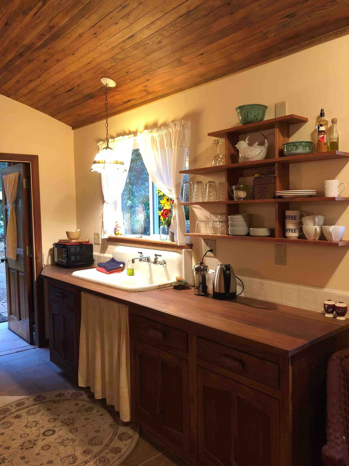 Hummingbird House is a tiny house decorated in a vintage style, with quality craftsmanship, making use of all recycled building materials. Tucked away on 20 acres with gardens all around, goats, hens, ducks, dogs and cats. The house is newly remodeled and has kitchen, bathroom, double bed, single bed/nook/couch, and dining area table and chairs, with modern heating and air conditioning. Coffee, herbal teas from the garden, sugar, honey, creamy goat milk and cheese are all supplied from the farm.