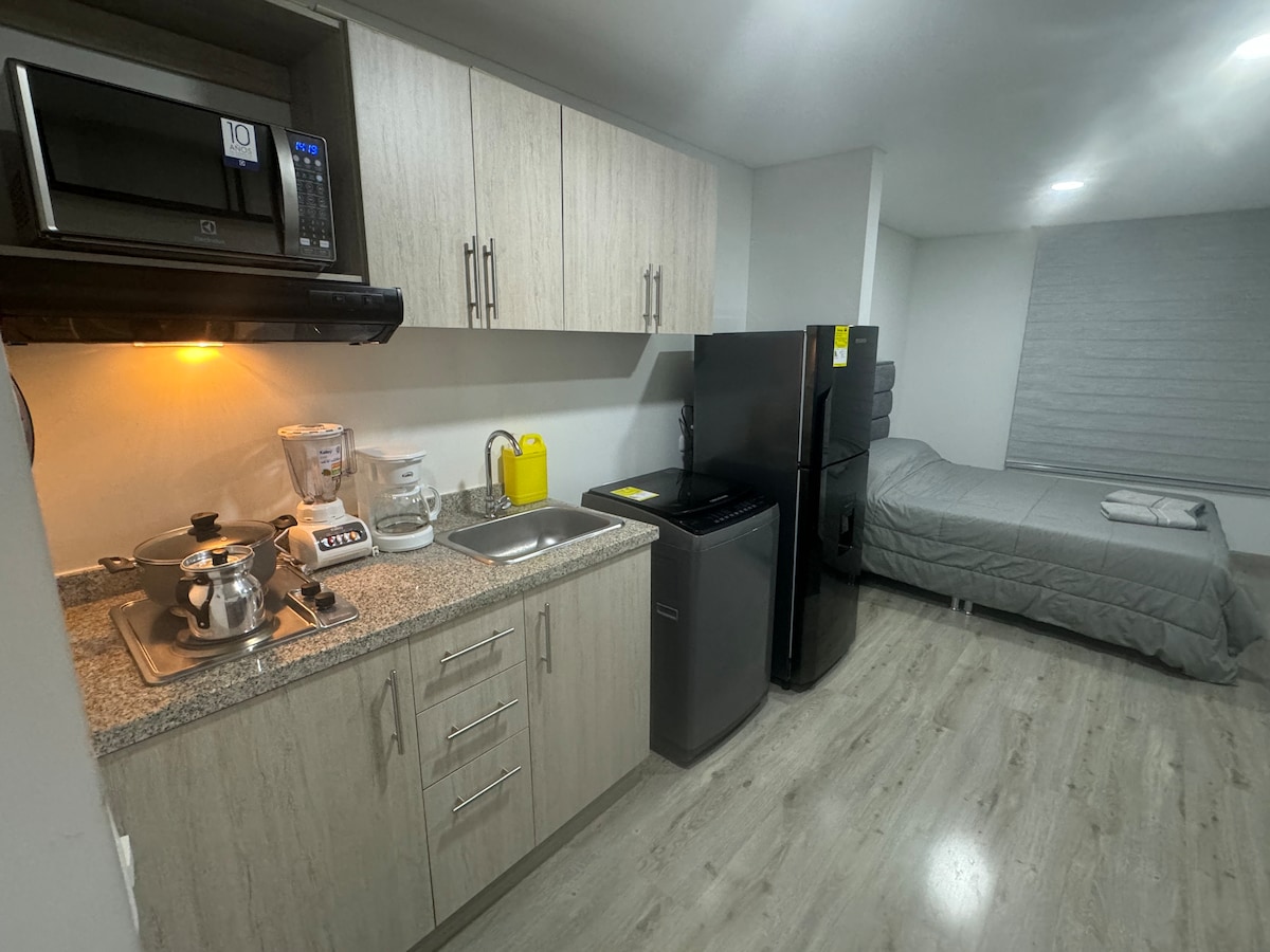 Acogedor apartamento, el cual cuenta con cama doble, televisor, escritorio, sofá, armario, baño privado y cocina con todos los implementos y electrodomesticos necesarios para uso del huésped, todo nuevo. El conjunto esta ubicado en una zona muy central, cerca del centro historico e internacional, donde se encuentran los mayores atractivos de Bogotá. Con vias de facil acceso y sistemas de trasporte publico que conectan el centro con el aeropuerto y la terminal de transporte.