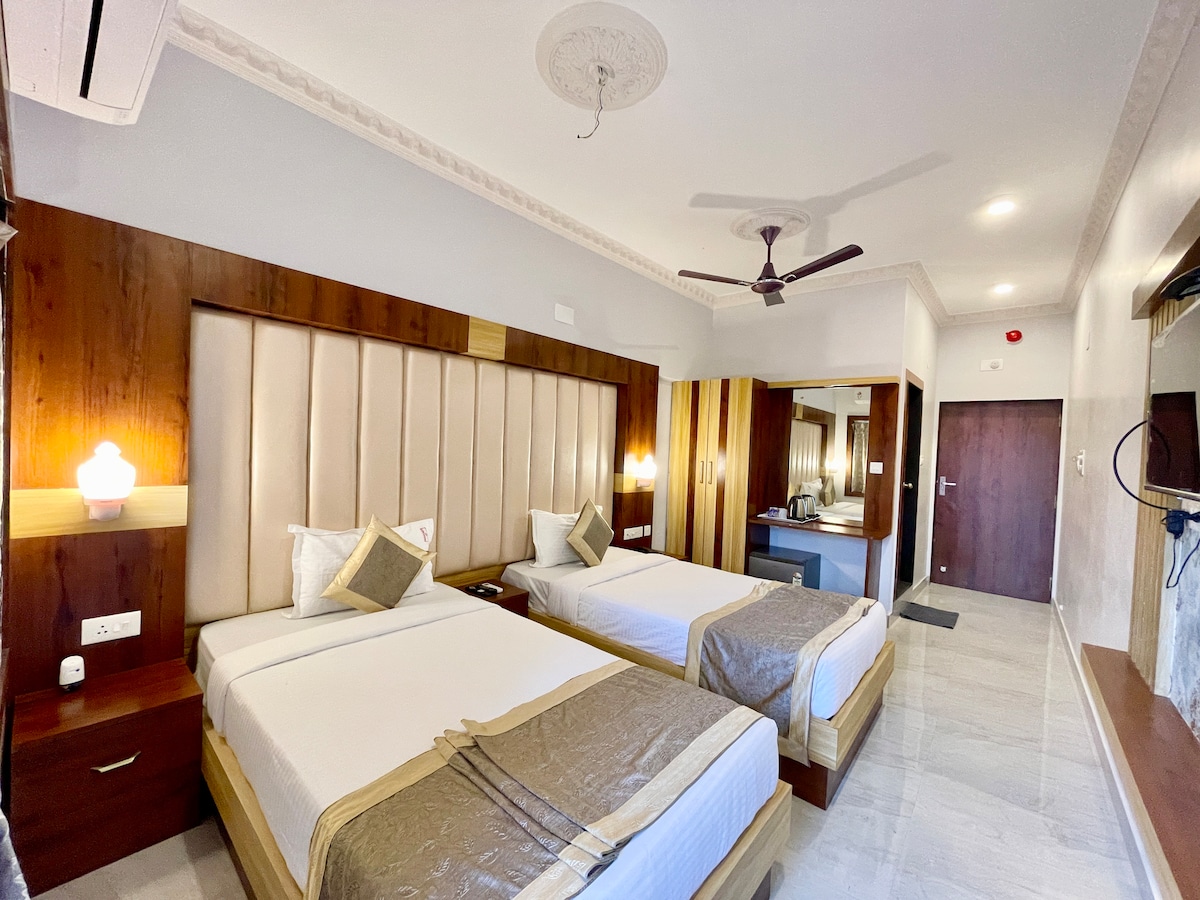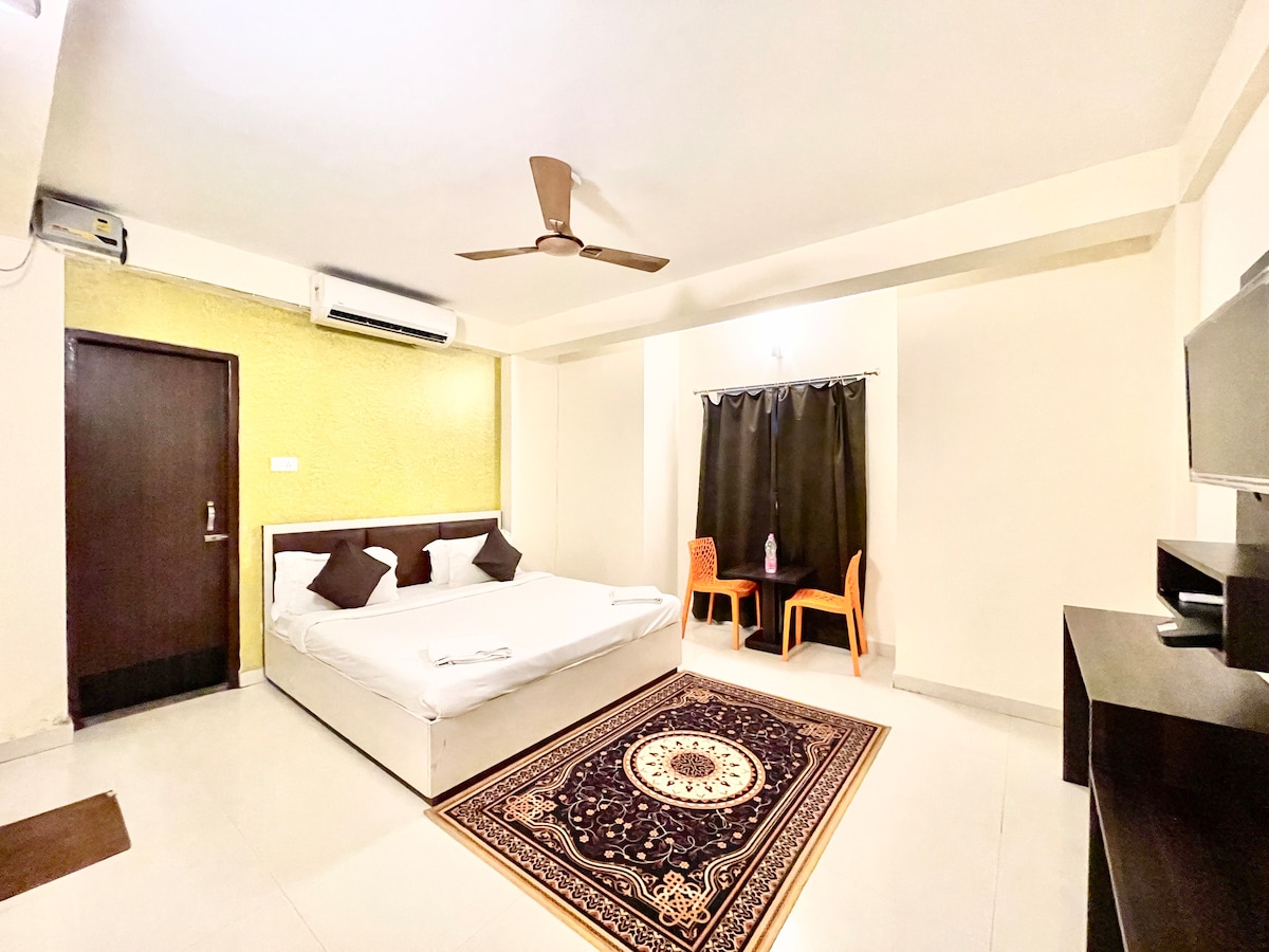 Enjoy easy temple and easy access to main road, with inhouse safe parking , low budget but well maintained AC rooms , cleaned twice daily.