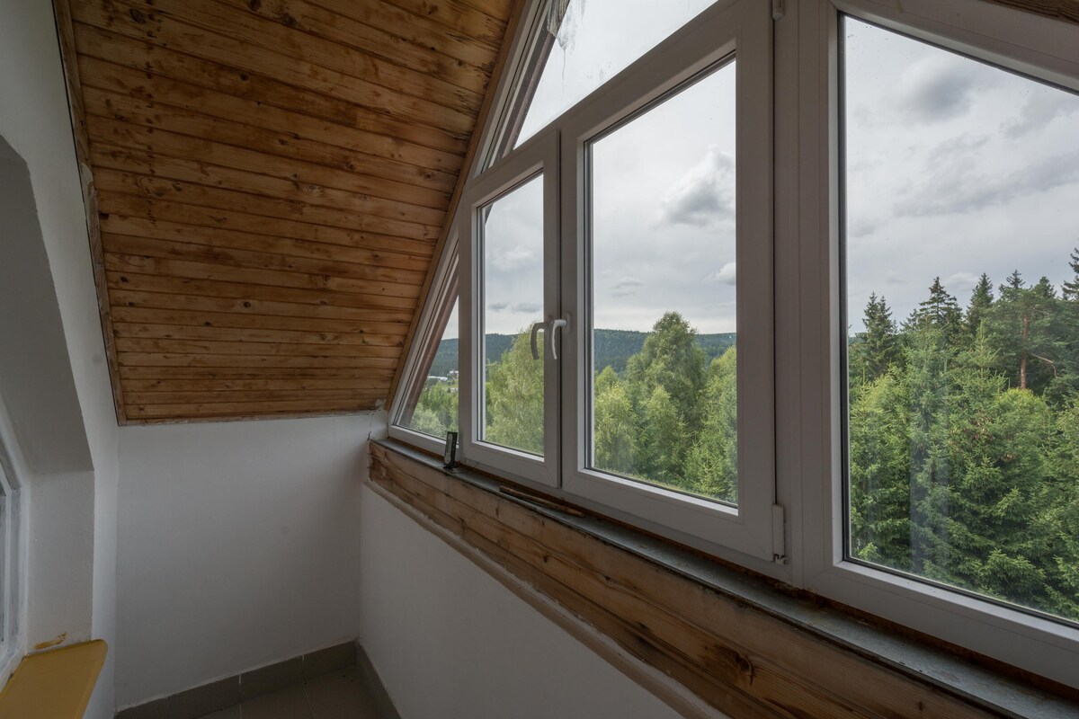 Toto stylové ubytování v srdci Jizerských hor s výhledem na nejvyšší horu Smrk a v klidné části Nového Města je vhodné pro páry i rodiny s dětmi. Nachází se blízkosti dvou nástupních míst na světově známé cyklostezky Singltrek, koupaliště, dětského hřiště, relaxačního a sportovního areálu a mnoha krásných turistických cílů. Byt je kompletně vybavený - nechybí ani pračka, sušička, televize, dětská postýlka nebo klimatizace.