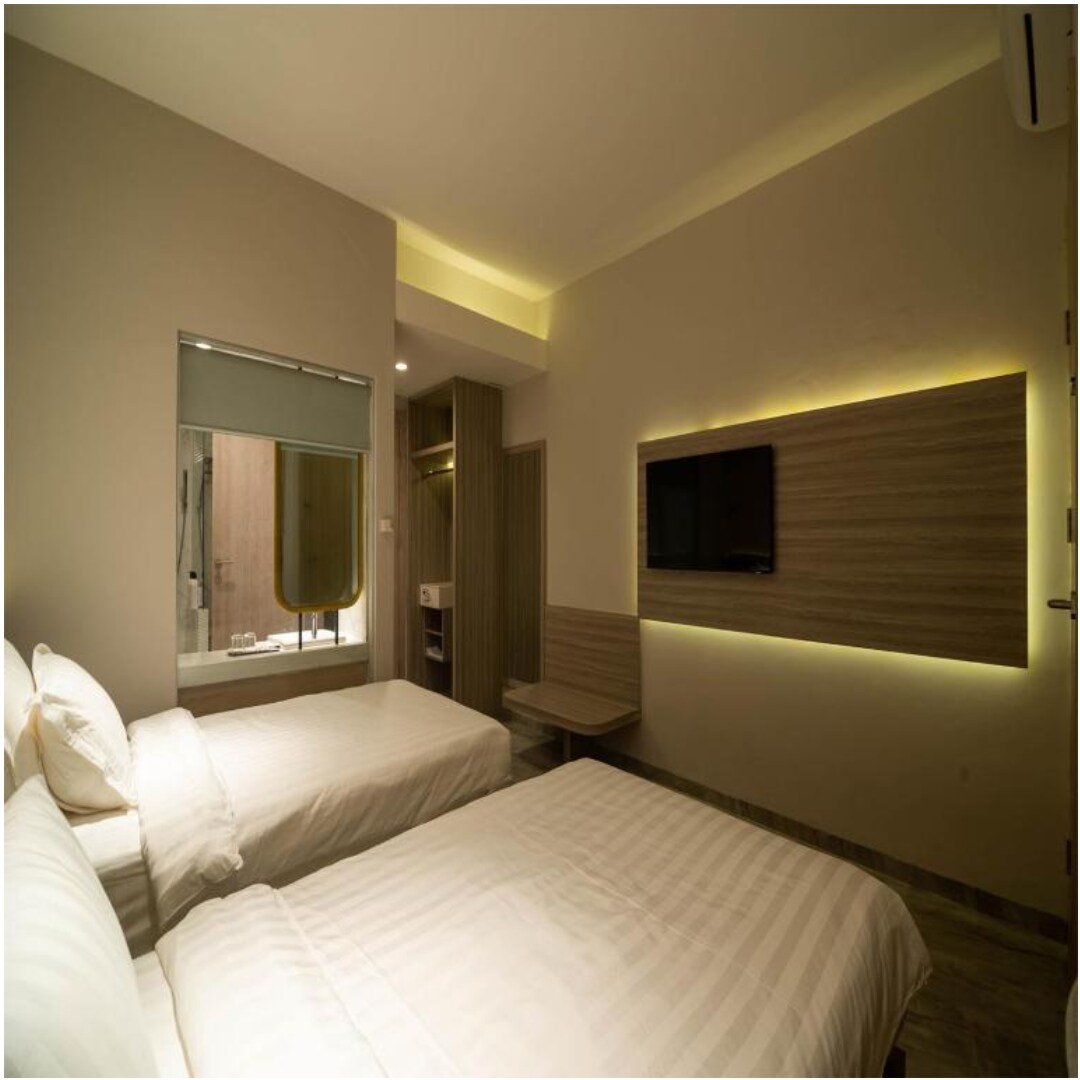 Kamar Double atau Twin 1 kamar dengan kamar mandi bersama 16平方メートル バルコニー Pemandangan landmark エアコン パティオ Teras Wi-Fi gratis Ukuran 16 m² 1 singledan1 double besar Tempat tidur nyaman, このエアコン付きのツイン/ダブルルームには、共用バスルーム、専用玄関、シーティングエリア、テラスがあります。このユニットにはベッドが2台あります。