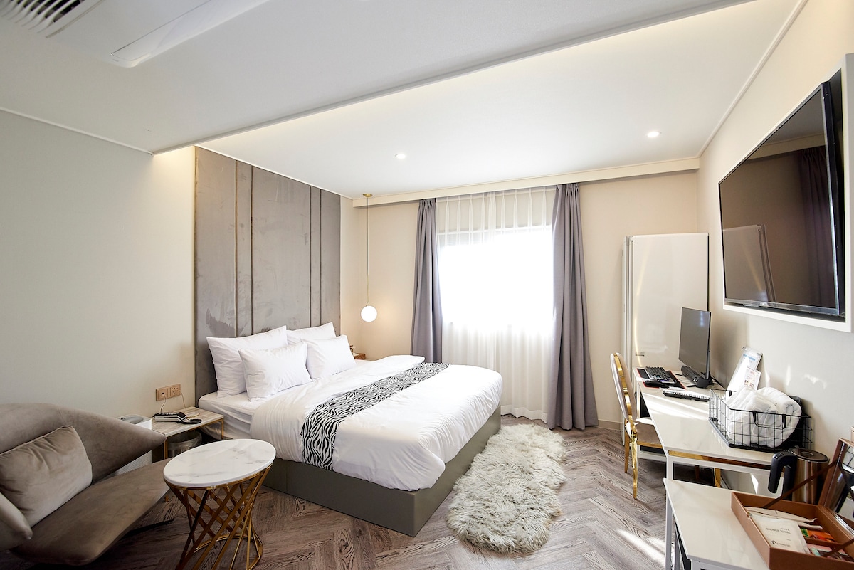 キングサイズのベッドとバスルームを備えた客室です。快適な環境、広い駐車場を誇ります。彫刻公園もあるので散歩に最適です。マサンの中心部に位置しているため、交通の便が良く、ジンヘ海洋公園、桜祭り、マサン魚市場、野球場などの主要観光スポットや官公庁、企業などの主要ビジネス施設へのアクセスが非常に良好です。アクセスとスタイルの両方を備えた宿泊施設です。