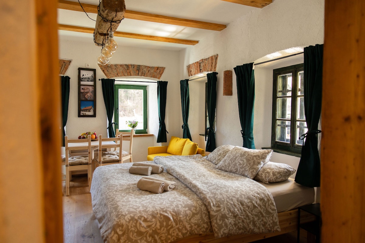 アパートビターは、1日だけの逃避行でも、1週間の休暇が必要な場合でも、リラックスして時間を楽しむためのプライベートなウェルネススペースを提供します。 モダンなリビングエリアにはキングサイズのベッド、設備の整ったキッチン、ダイニングテーブル、暖かい暖炉の隣にソファがあります。 寒い冬の日には、専用サウナとジャグジーでリラックスしましょう。 外に出たい場合は、近くの川で泳ぎ、スロベニアアルプスでハイキング、サイクリング、スキーを楽しむことができます。