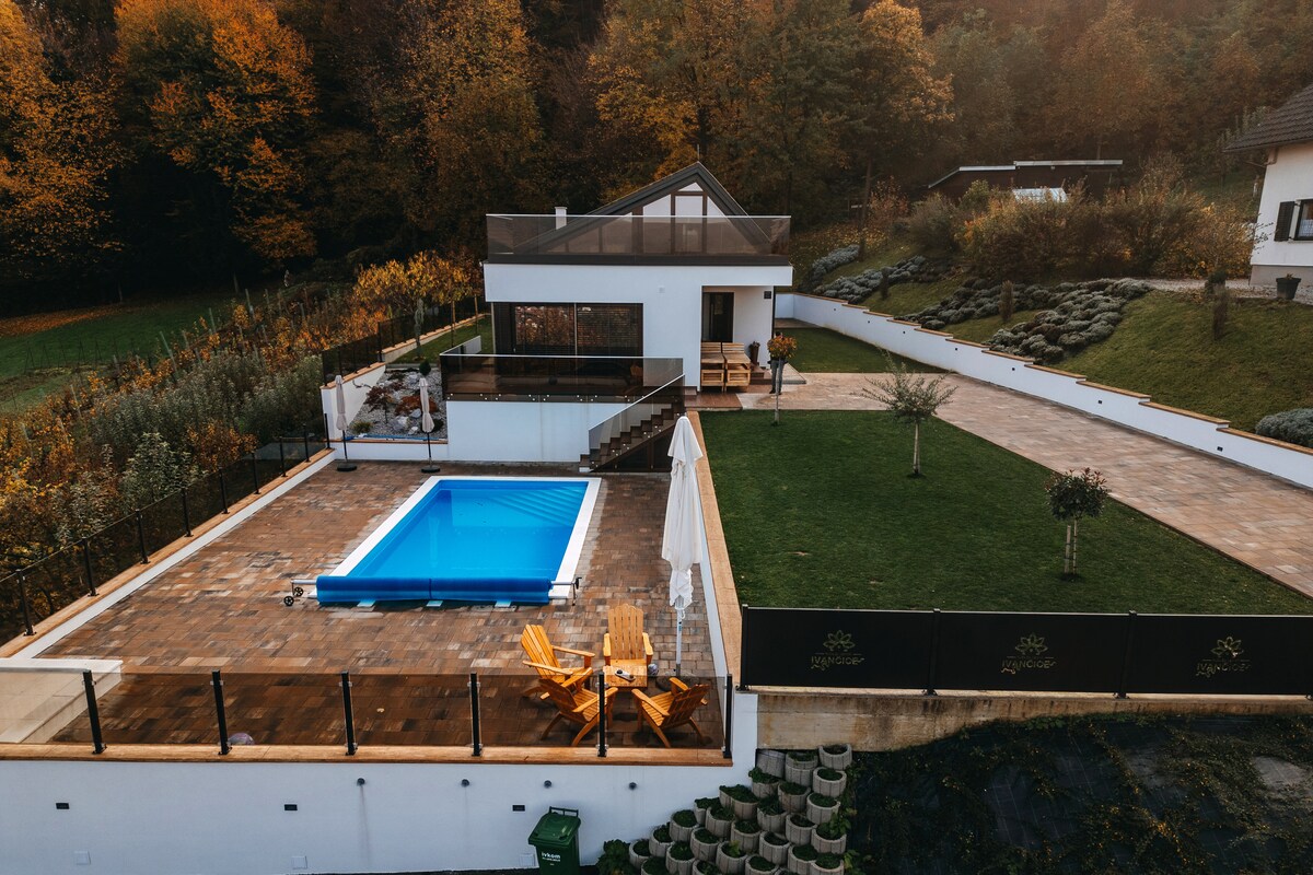 Countryside Home 39 is located in a peaceful natural setting, surrounded by forest and close to Mount Ivančica. This modern holiday home accommodates up to 6 guests and is ideal for families and friends. It features a heated outdoor swimming pool, sun terrace and spacious garden, as well as an indoor spa with sauna and jacuzzi. A fireplace, billiards and a barbecue terrace complete the experience. Perfect for relaxation, active holidays, hiking, cycling and tranquility.