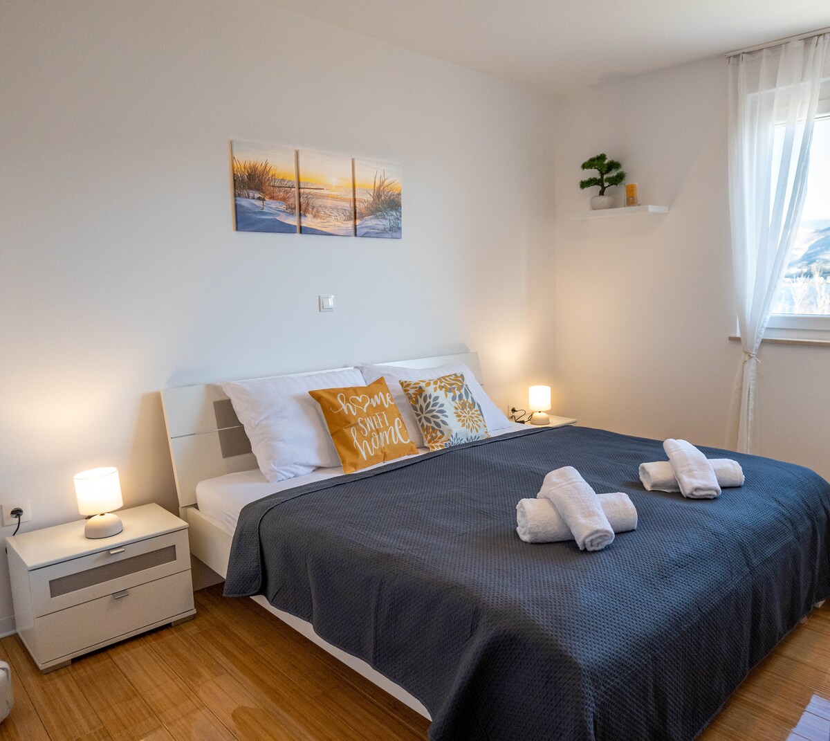 Uživajte sa svojom obitelji u ovom modernom smještaju. Apartman ima dvije spavaće sobe (u jednoj je bračni ležaj, dok su u drugoj dva odvojena), kompletno uređena kuhinja sa perilicom suđa, kupaona sa tuš kabinom te perilicom rublja, dnevni boravak te balkon sa prekrasnim pogledom na more koje je vrlo blizu.