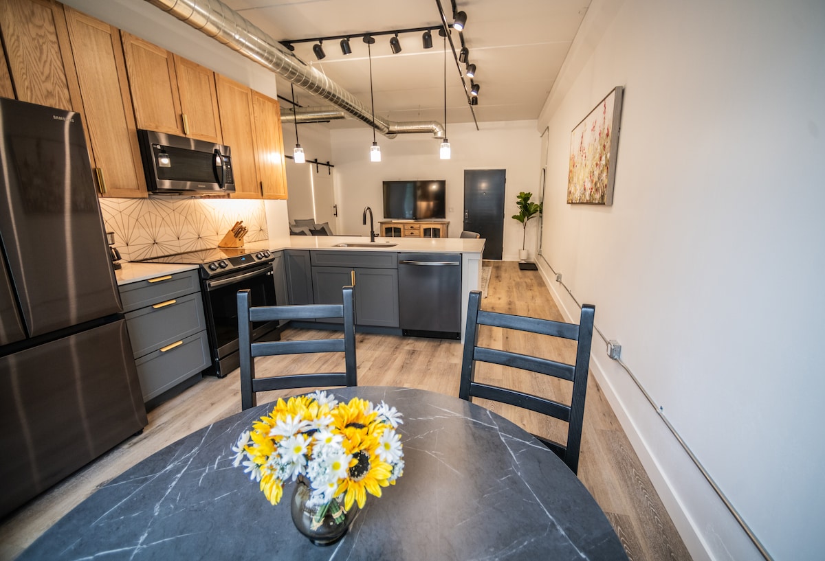 Step away from cookie-cutter condos and into an extraordinary living space. The Firehouse One Building was the first Fire Station in the city, constructed back in 1891 and thoughtfully renovated in 2022. With 3 bedrooms and 2.5 bathrooms, this is the largest of 6 beautiful vacation rentals in the building. With 12 foot tall ceilings accented with hand hammered tin and floor to ceiling brick walls throughout, this incredible loft can comfortably accommodate 8 overnight guests.