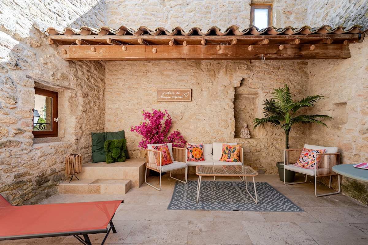 ボニユーの小道とブドウ園の間にある19世紀のシルク農家で、本物のプロヴァンスを味わえます。ブドウの木が見えるテラスでエスプレッソの香りに目覚め、鐘の音に合わせて温かいクロワッサンを買いに行きましょう。歴史的な石の壁とオークの梁が、ファームハウスのキッチンとフランス製のリネンと調和しています。日中は市場を訪れ、ワイナリーを探索し、夕暮れ時には星空の下でワインを楽しみましょう。春の桜と夏のラベンダー畑が季節の魅力を引き立てます。村のパン屋からわずか5分の場所にありながら、静かで人里離れた場所にあります。