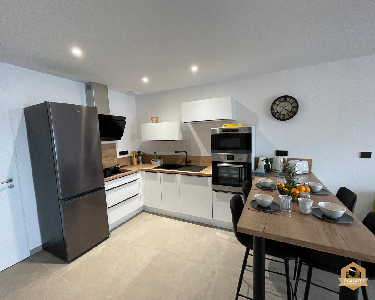 65平方メートルの美しいヴィラの1階にあるキッチンは、ソファーベッド、テレビ、Wi-Fiが備わったリビングに面しています。明るく、冷暖房完備で、広い庭とプライベートテラスに面しています。特権的な立地で、美しい山の景色を望むことができます。木々に囲まれていて、静かで、美しい砂浜(銀の浜辺..)に近く、すべてのアメニティに近く、ポルティショの中心部、アジャクシオのシャトルボートのアクセス、空港から10分です。