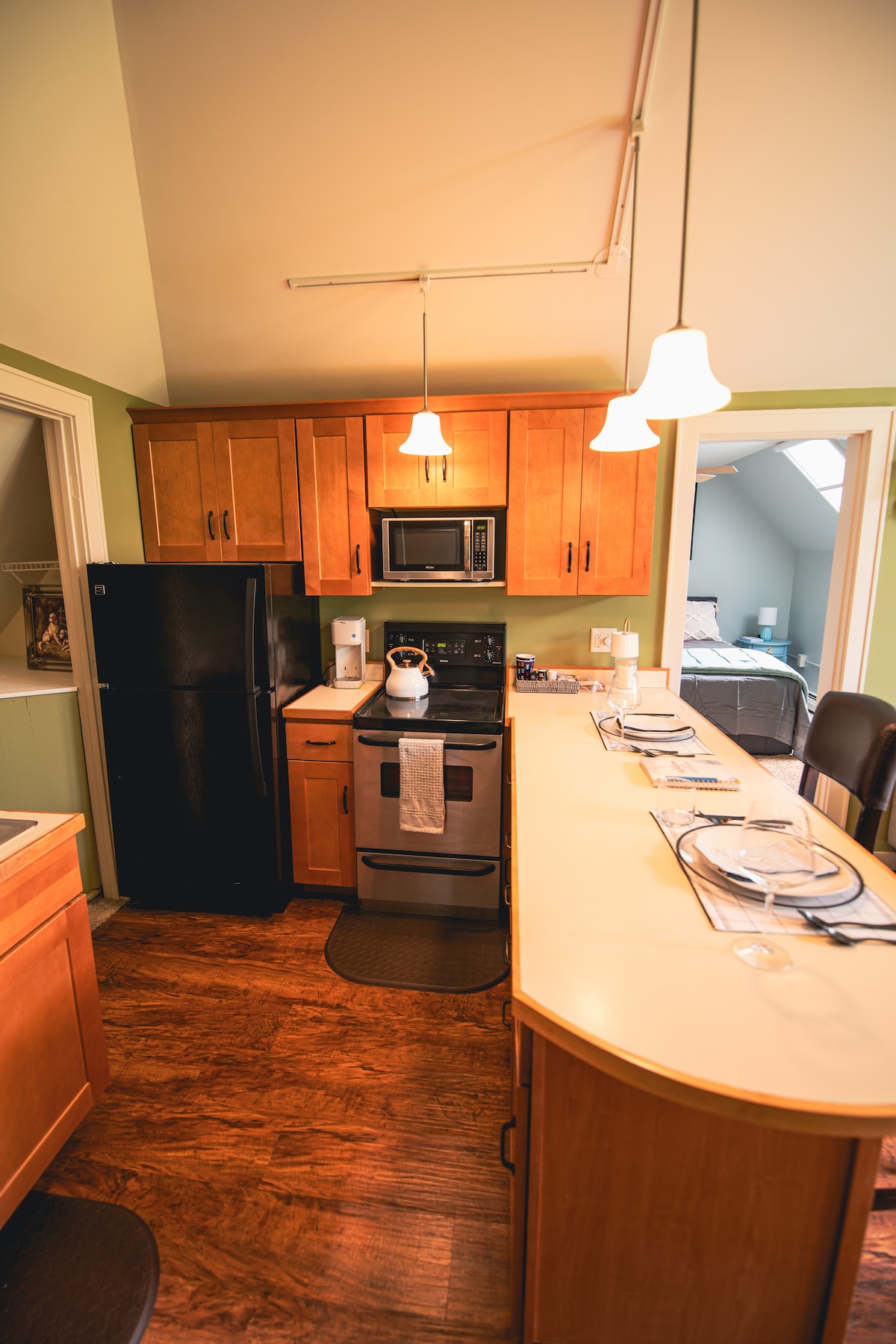 ゲストルームには、夏用の小さなテーブルと椅子が備わった、屋根付きの裏ポーチの外にある専用玄関があります。壁掛けのエアソース、ヒートポンプから調節可能な暖かい空気と冷たい空気が出ます。 小さなキッチンのアルコーブは、コーヒーや紅茶、軽食に便利です(オーブントースター、シングルインダクション「ホット」プレート、給湯器) 私たちは歴史的な建物に住んでいます。私たちの近所はルート100にとても近いです。ウォーターベリー村とストウも近くにあり、スキー、ハイキング、サイクリングも楽しめます。