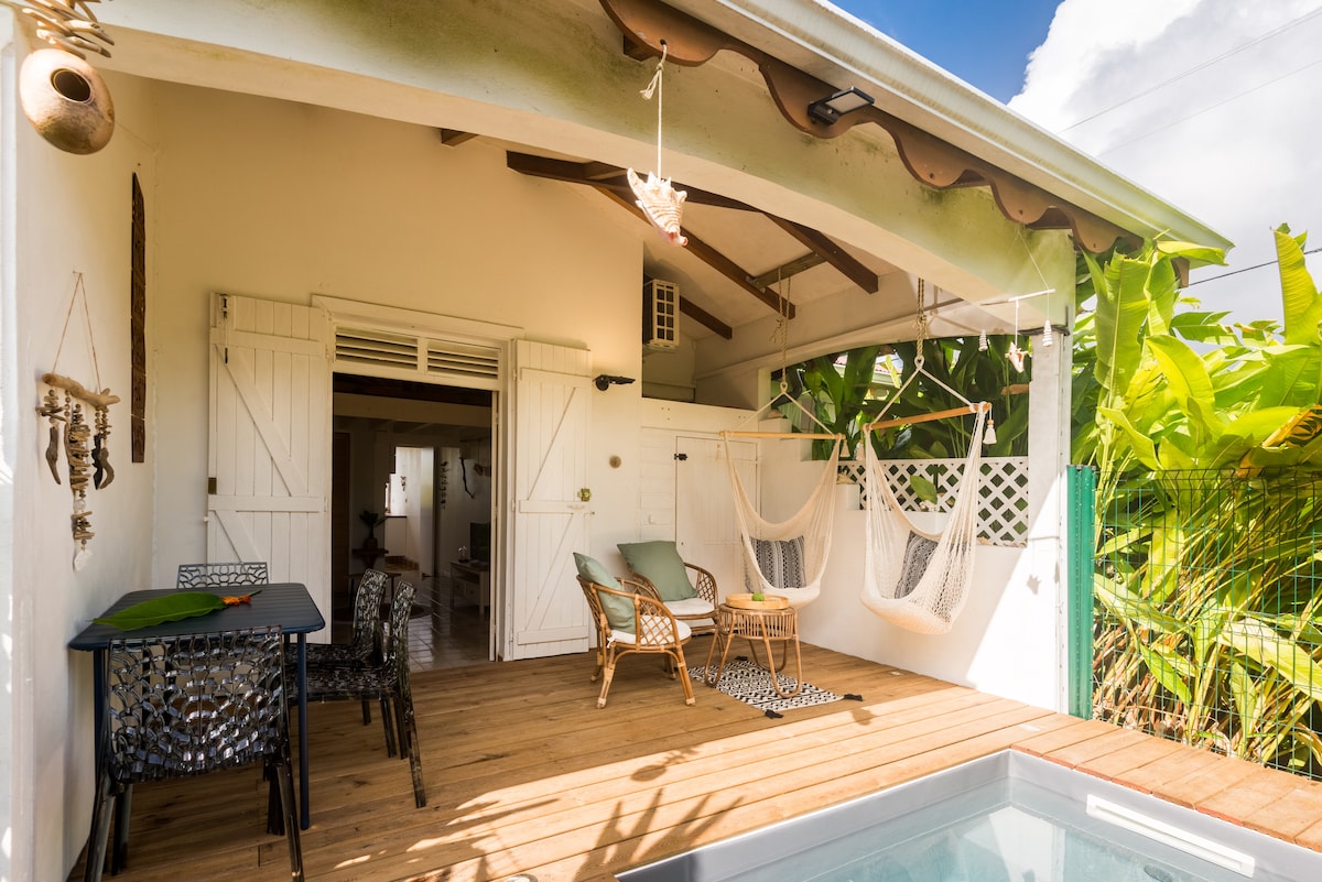 サントアンヌの魅力的な🌴コテージ、1人または2人の子供連れのカップルに最適 ビーチ🏖️ から1.5キロ、村や商店街に近い 別のコテージと共有するプールにアクセスできるプライベート🌺テラス 🔥 バーベキュー 緑豊かな環境の中で、きちんと整えられたフレンドリーな✨装飾 📶 Wi-Fi 設備の整った🍳キッチン 🛏️ リネン類をご用意 👶 ベビーベッド(リクエストに応じて) 💧 貯水タンク 前🚗 の駐車場 到着時の必需🛍️品 グアドループの太陽の下で快適な滞在を